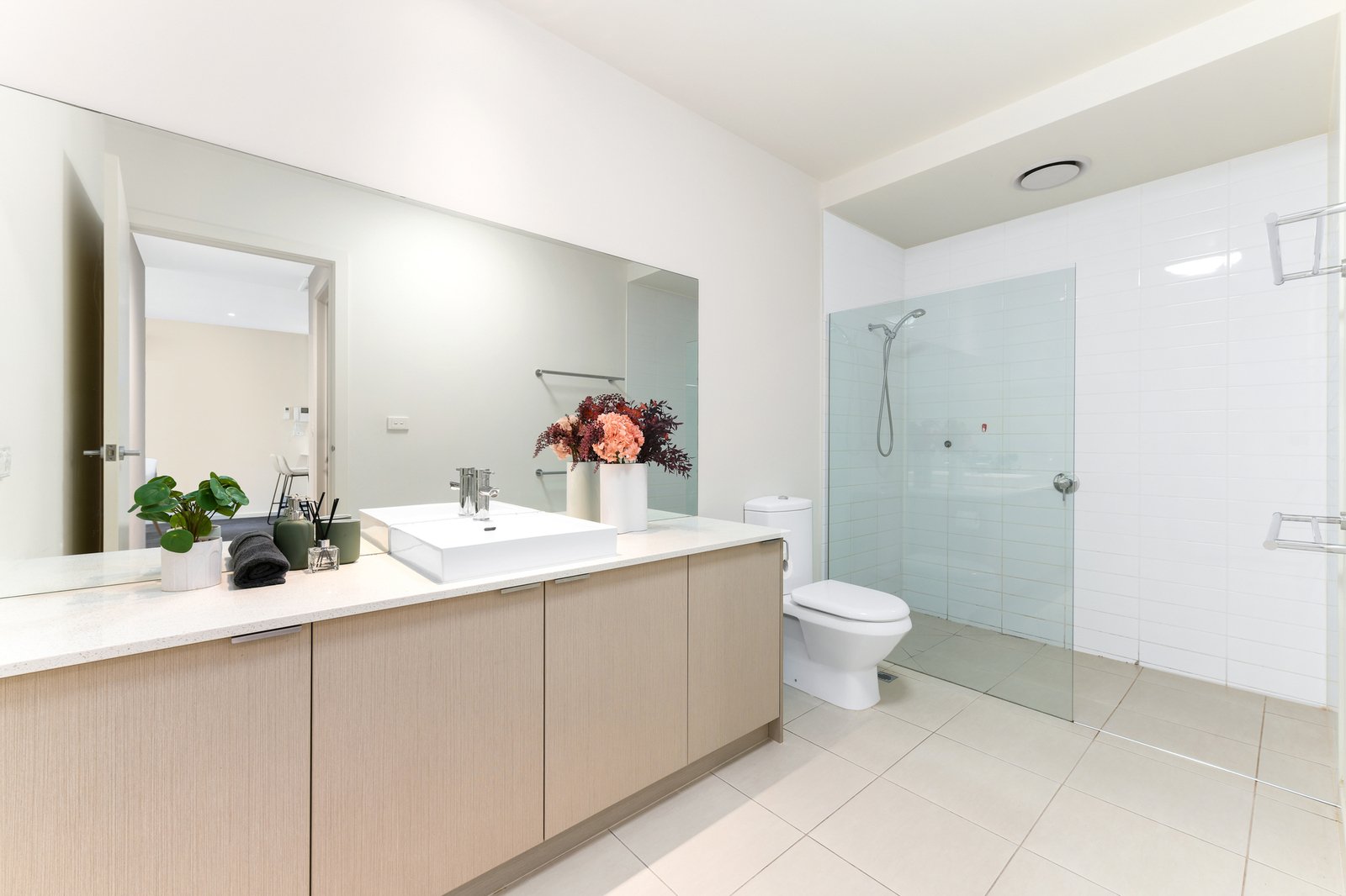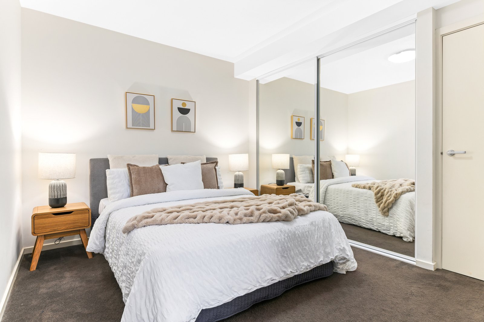 Both bedrooms are well-sized and offer built-in robe storage. The sizeable luxe bathroom features a generous stone-top vanity, a frameless mirror, and a frameless oversized shower, all adding to the apartment’s modern appeal.