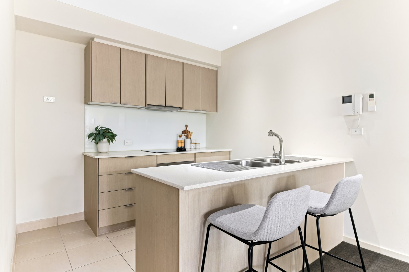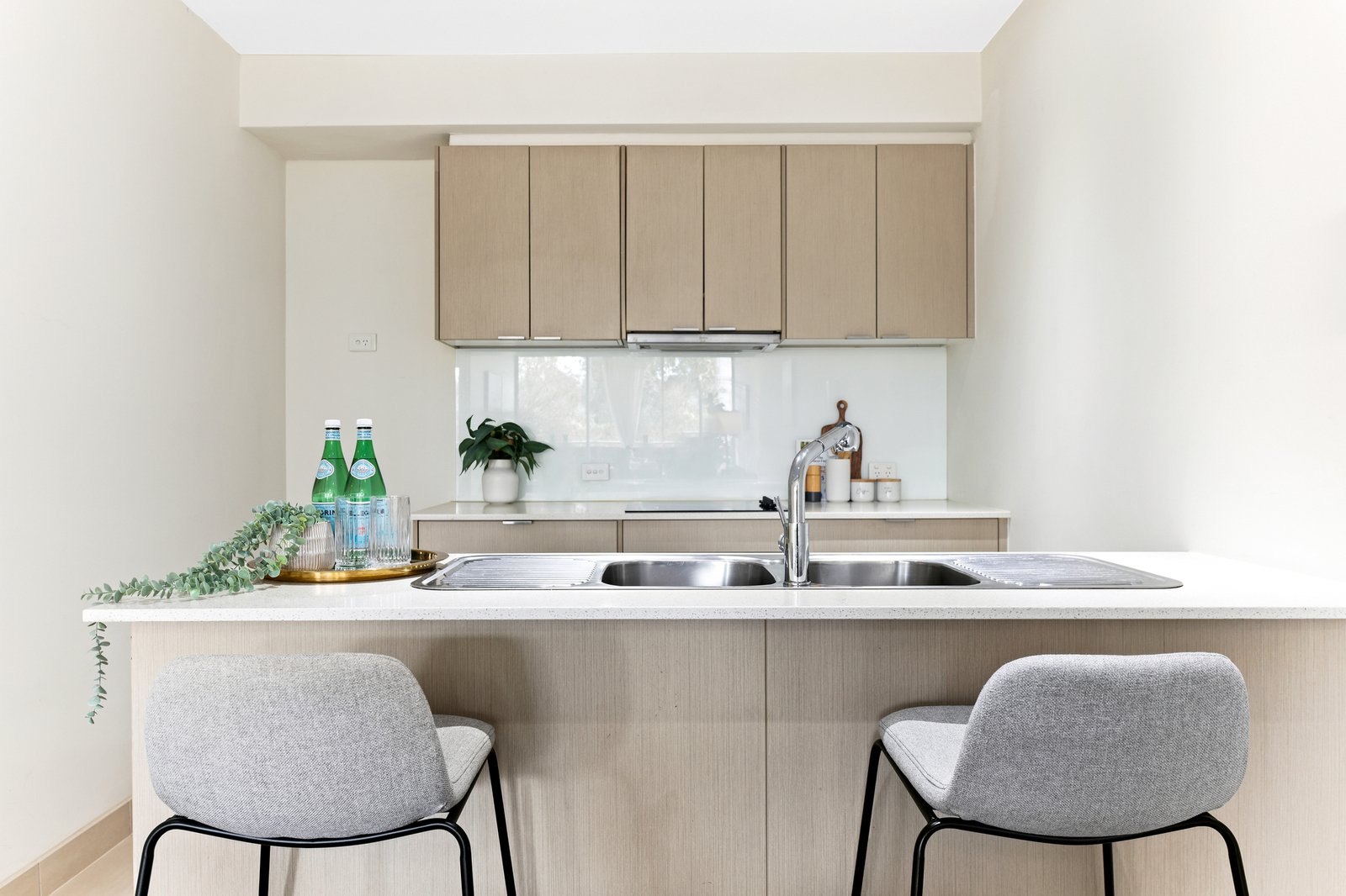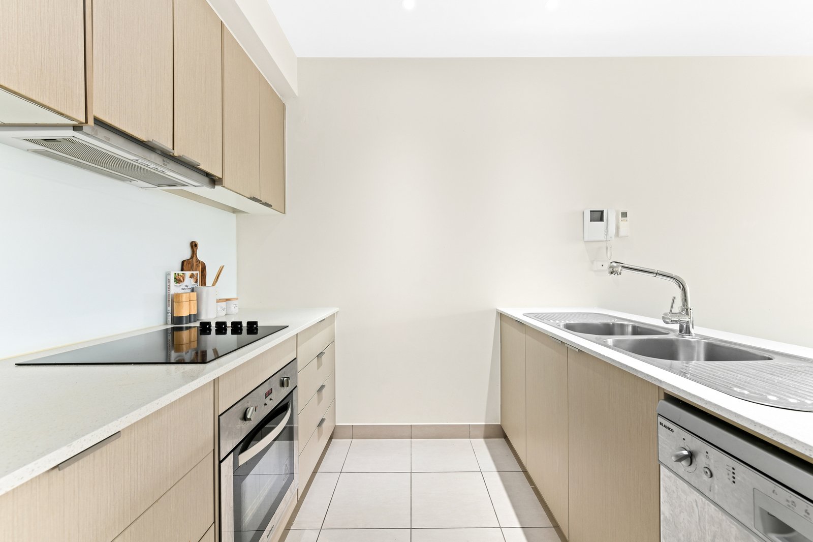 The kitchen is well-appointed with tiled flooring and a coffered ceiling, along with 20mm stone countertops that provide ample preparation space. A three-seater breakfast island adds functionality, while light oak-inspired laminate handleless cabinetry and a muted white glass splash-back create a stylish aesthetic. The kitchen is equipped with a Blanco stainless steel dishwasher, an integrated oven, and an induction cooktop, all complemented by modern mixer tapware.