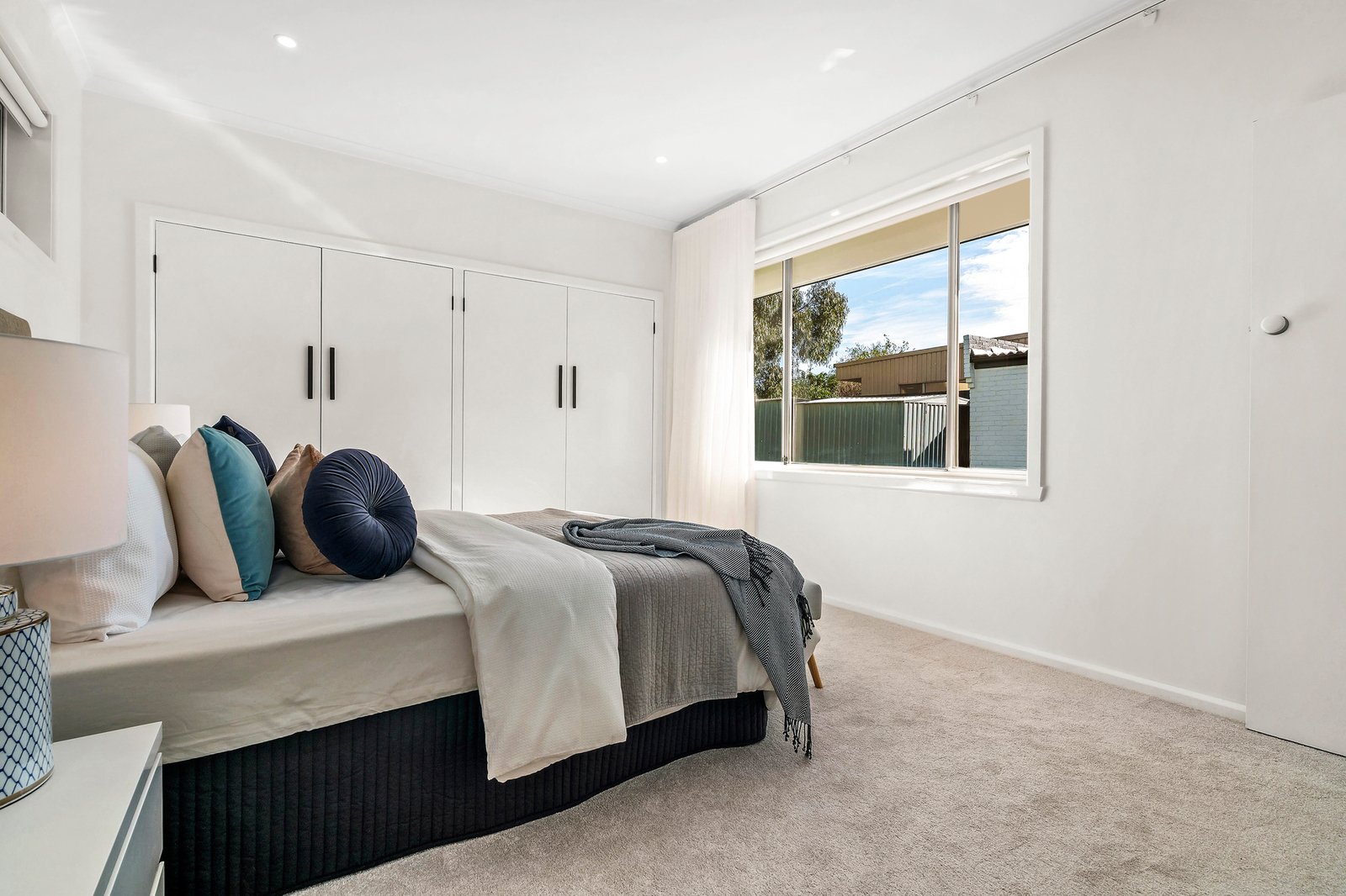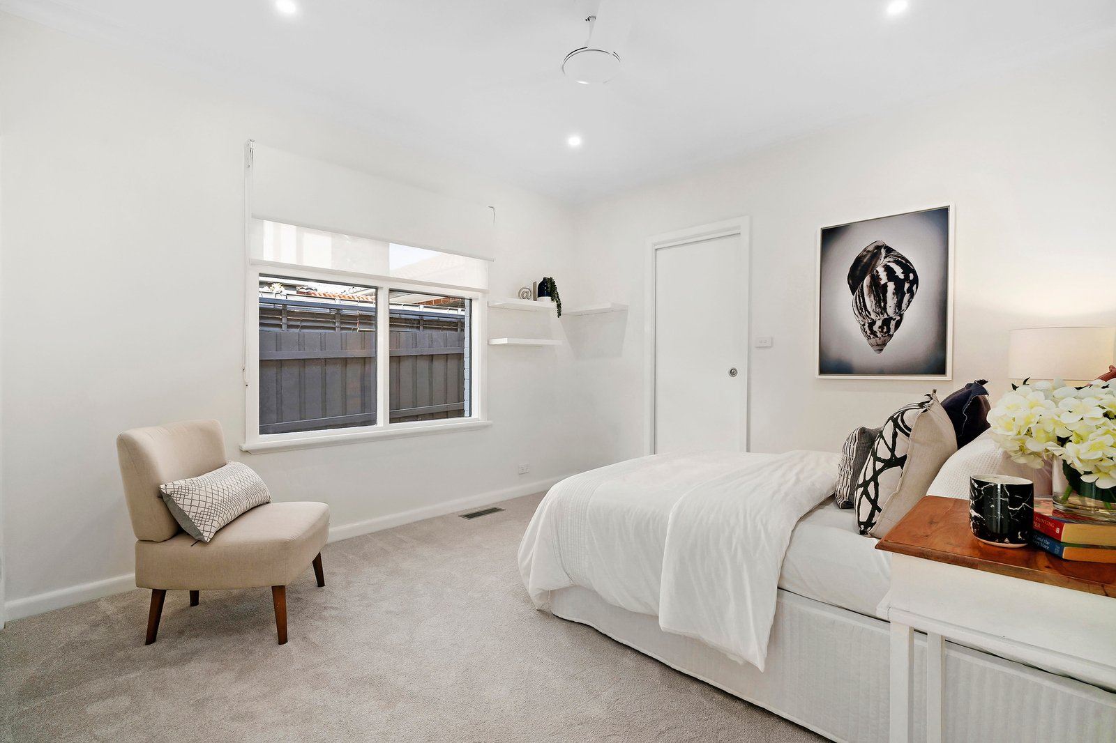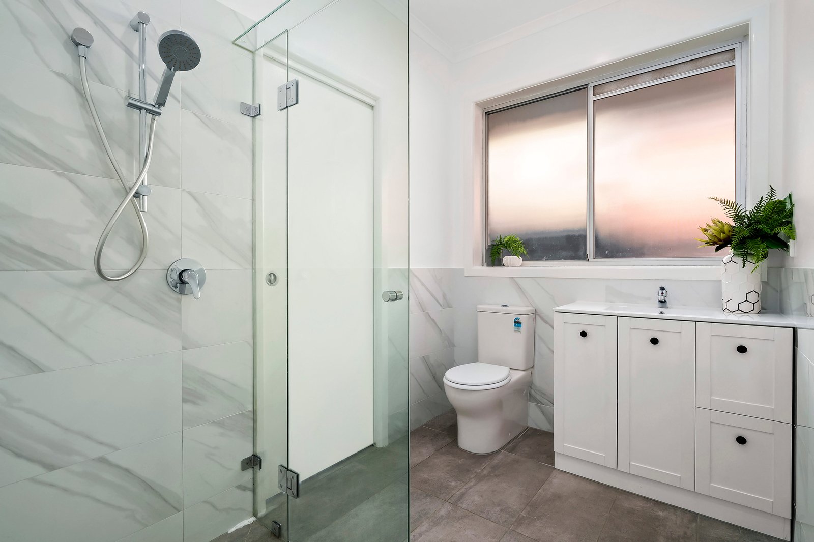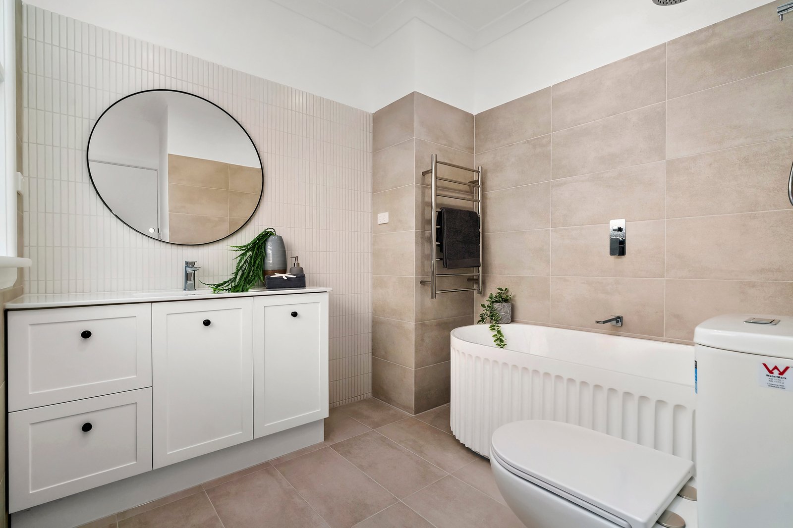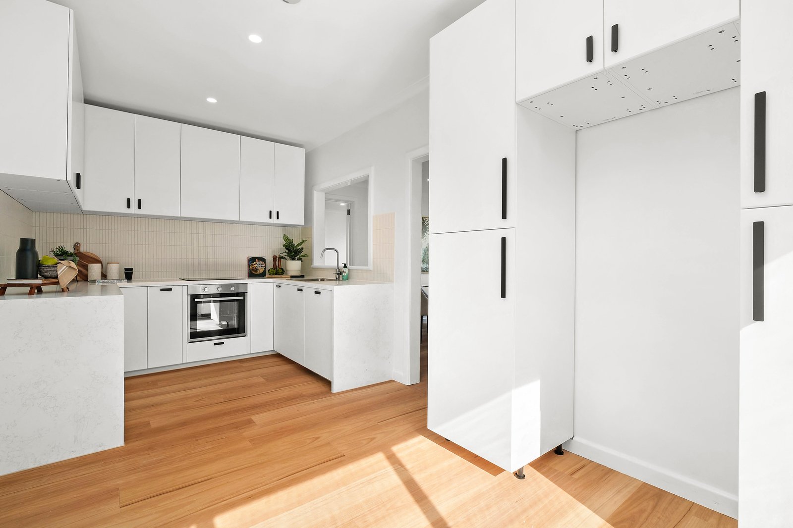 Stylish modern selections include a fluted bath, heated towel rail, fitted robes, 40mm waterfall stone benchtops, all new kitchen appliances, Ring doorbell security cameras, and a feature blue front door to lift the spirits when you arrive home.