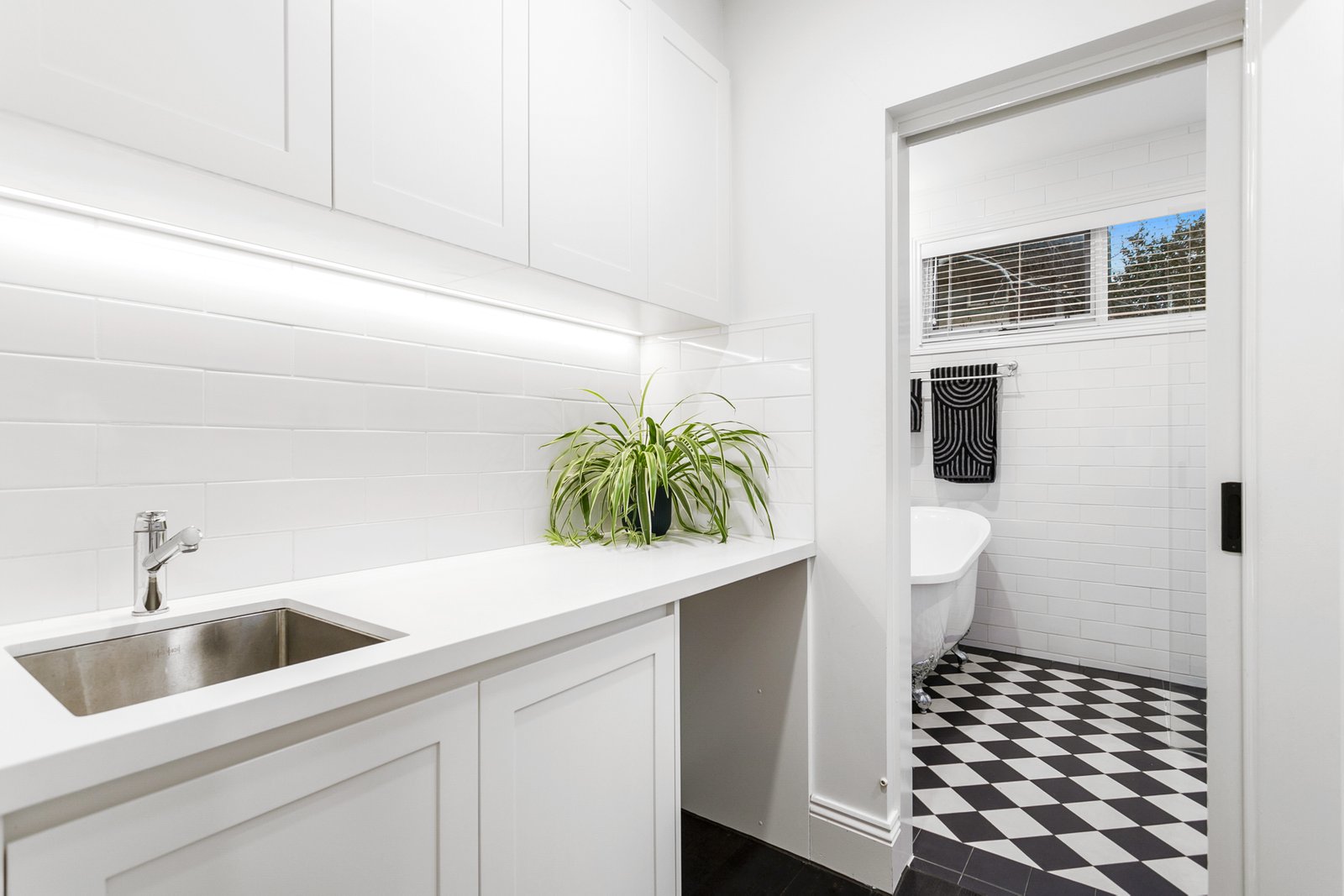separate powder room off the laundry ensures convenience for guests.