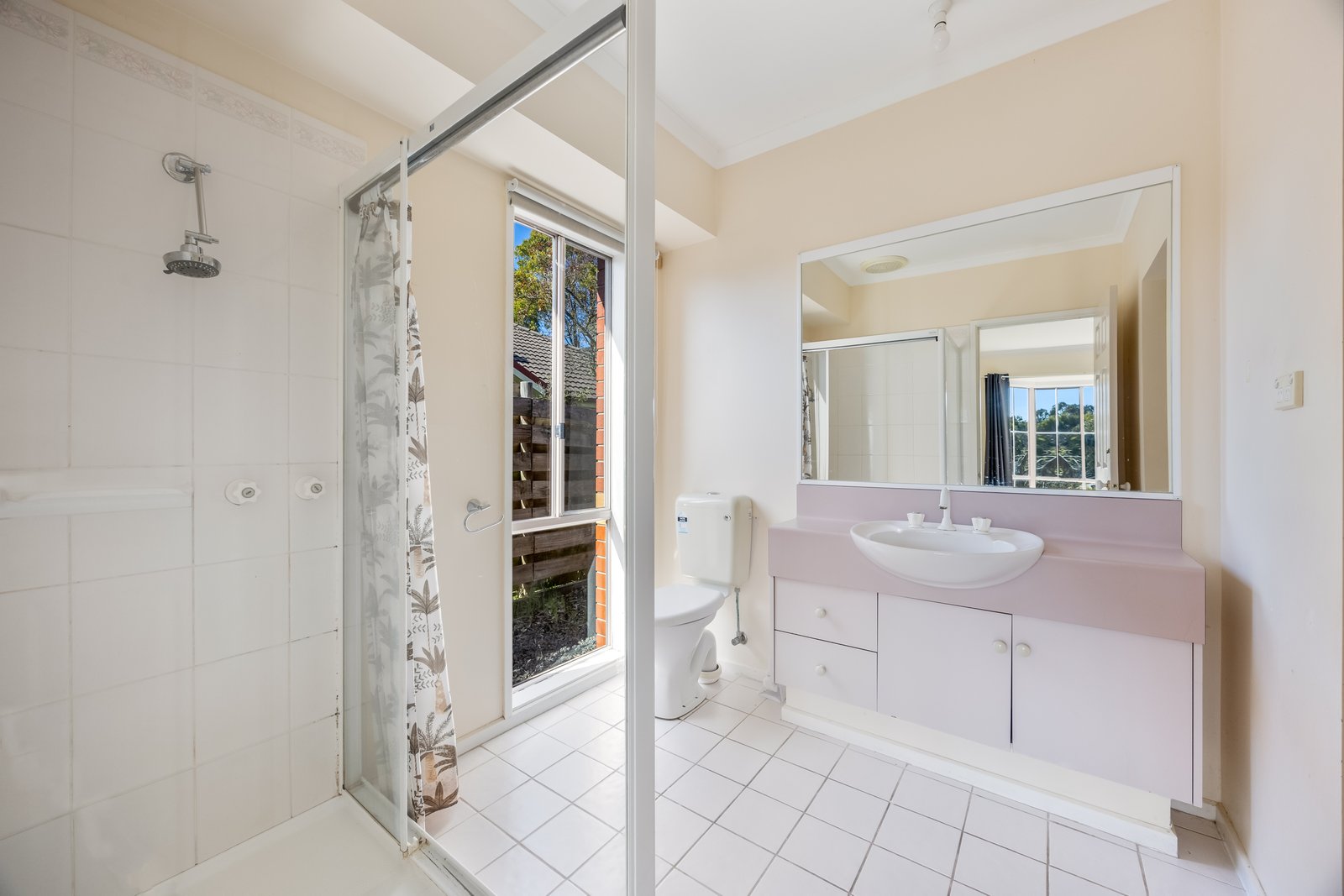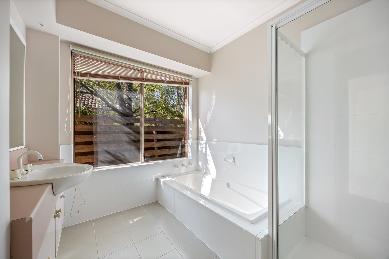 - Main bathroom with shower, separate bath and vanity.