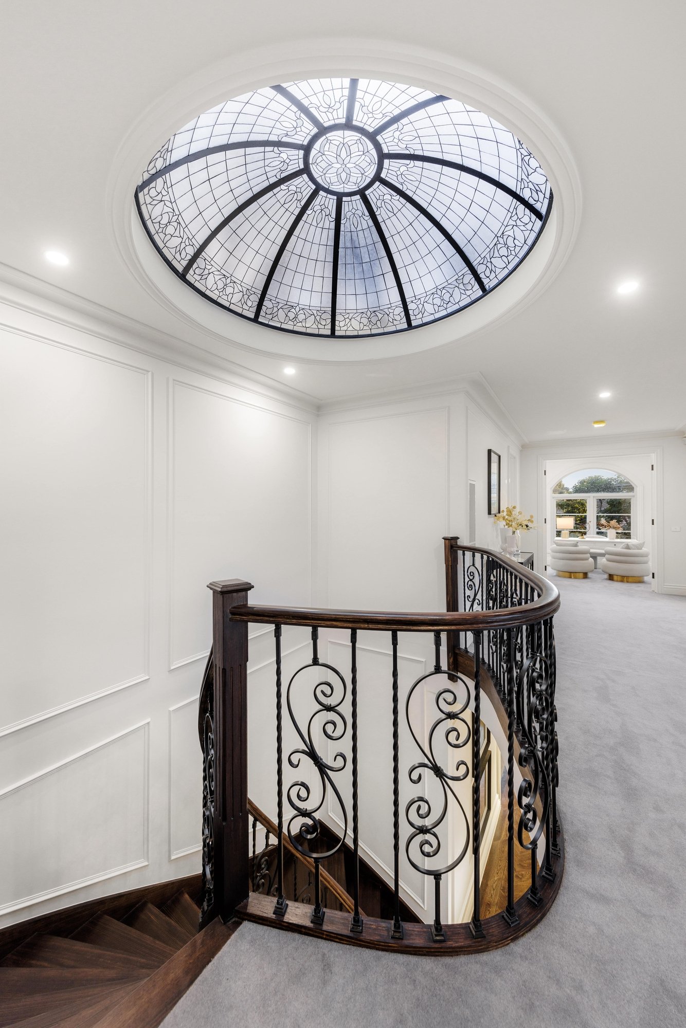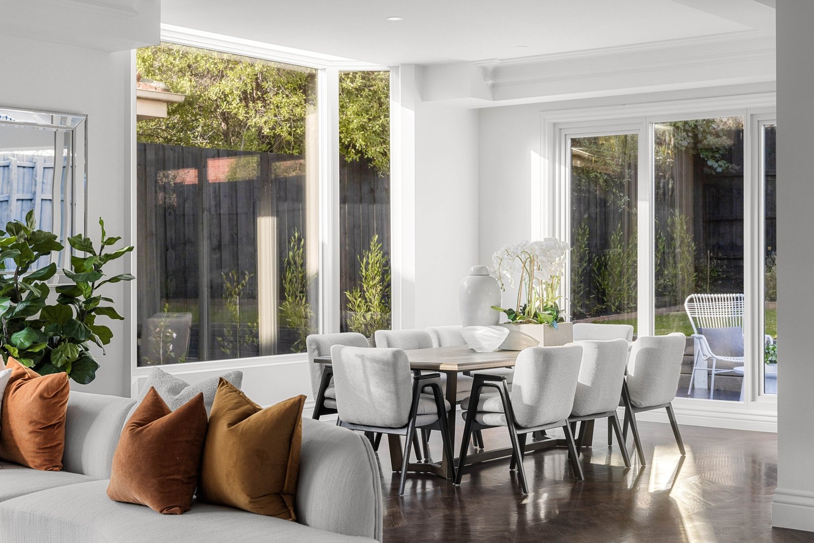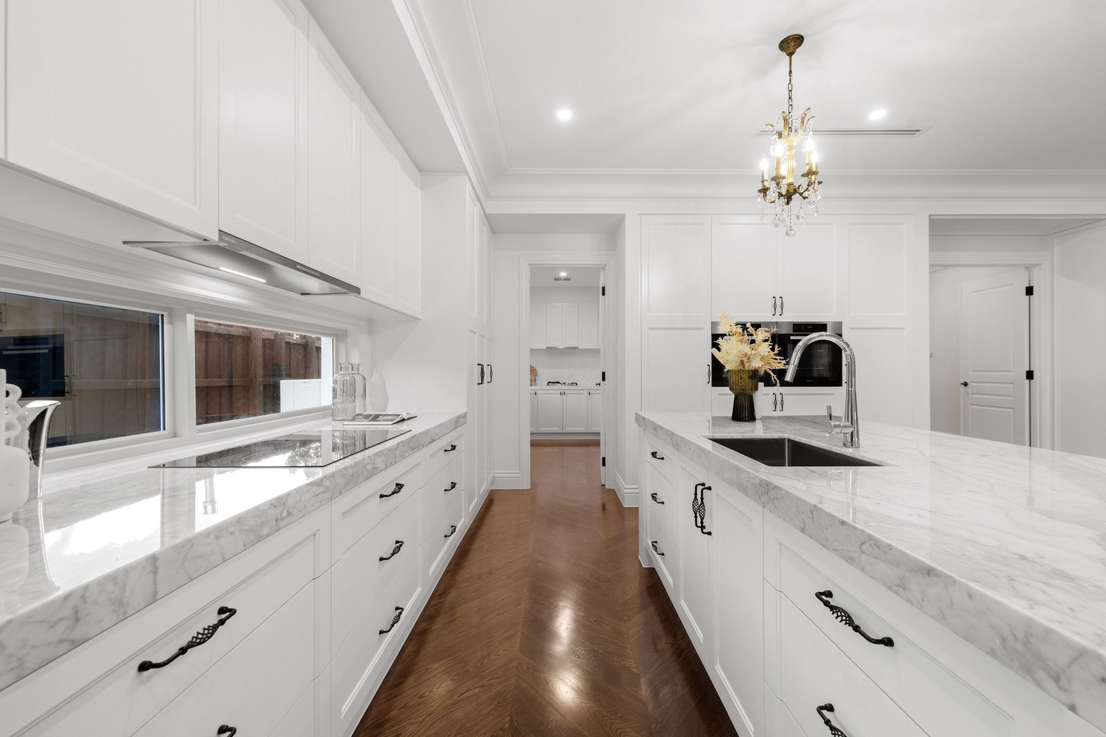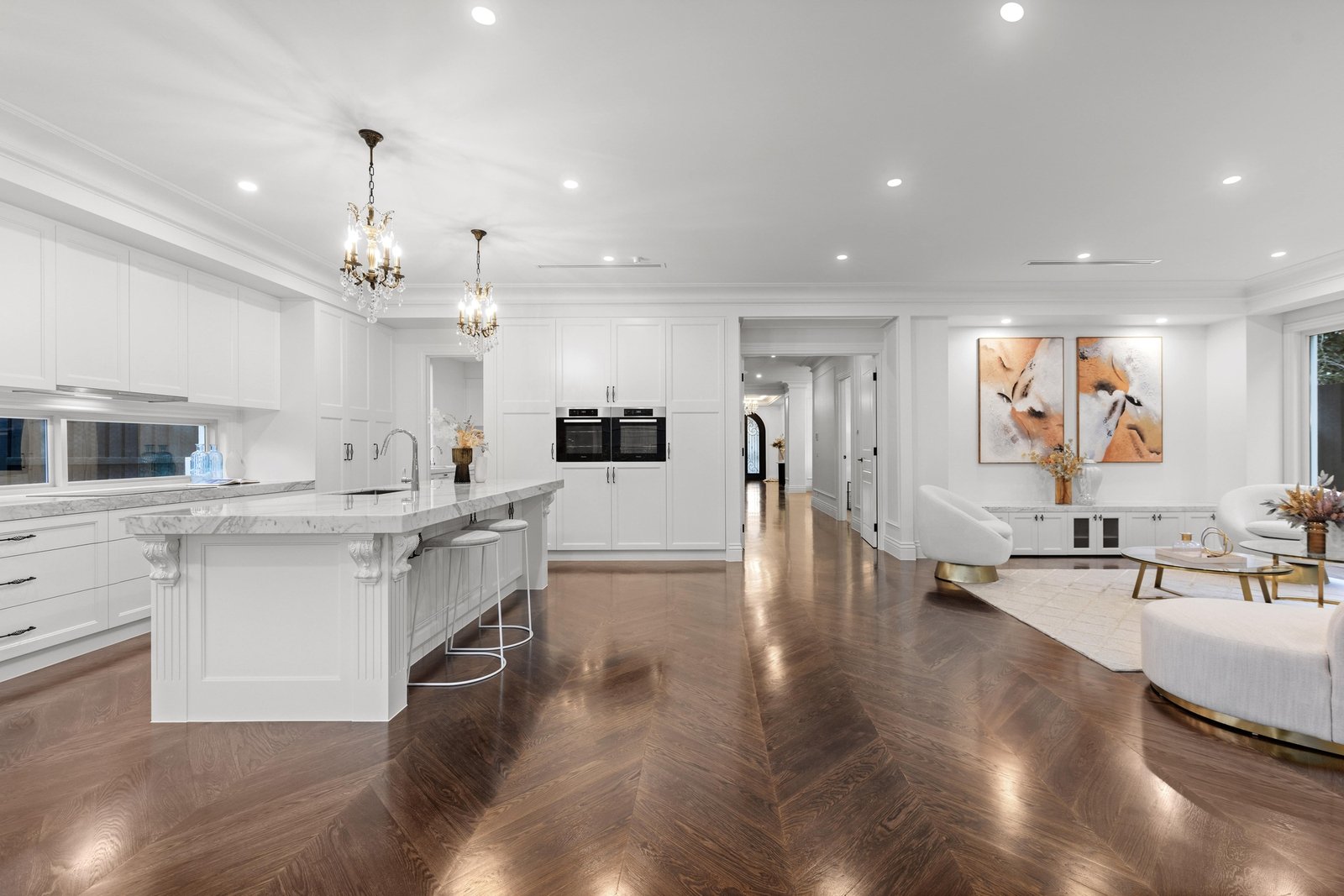 At its heart, discover an impressive and sunlit family room and dining domain featuring quality herringbone timber floors and designer chandeliers, served by a gorgeous kitchen that celebrates fine dining and entertaining, equipped with premium Miele appliances, imported Italian marble benches, and a large butler’s pantry.