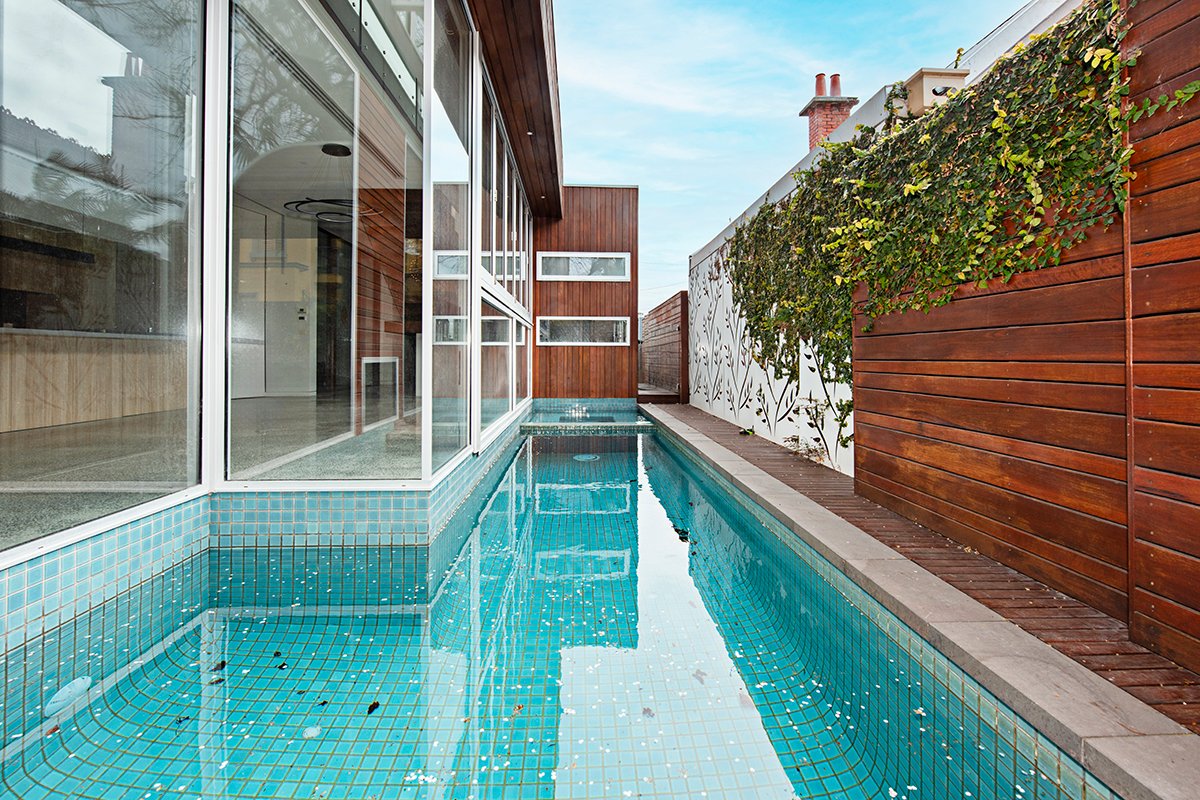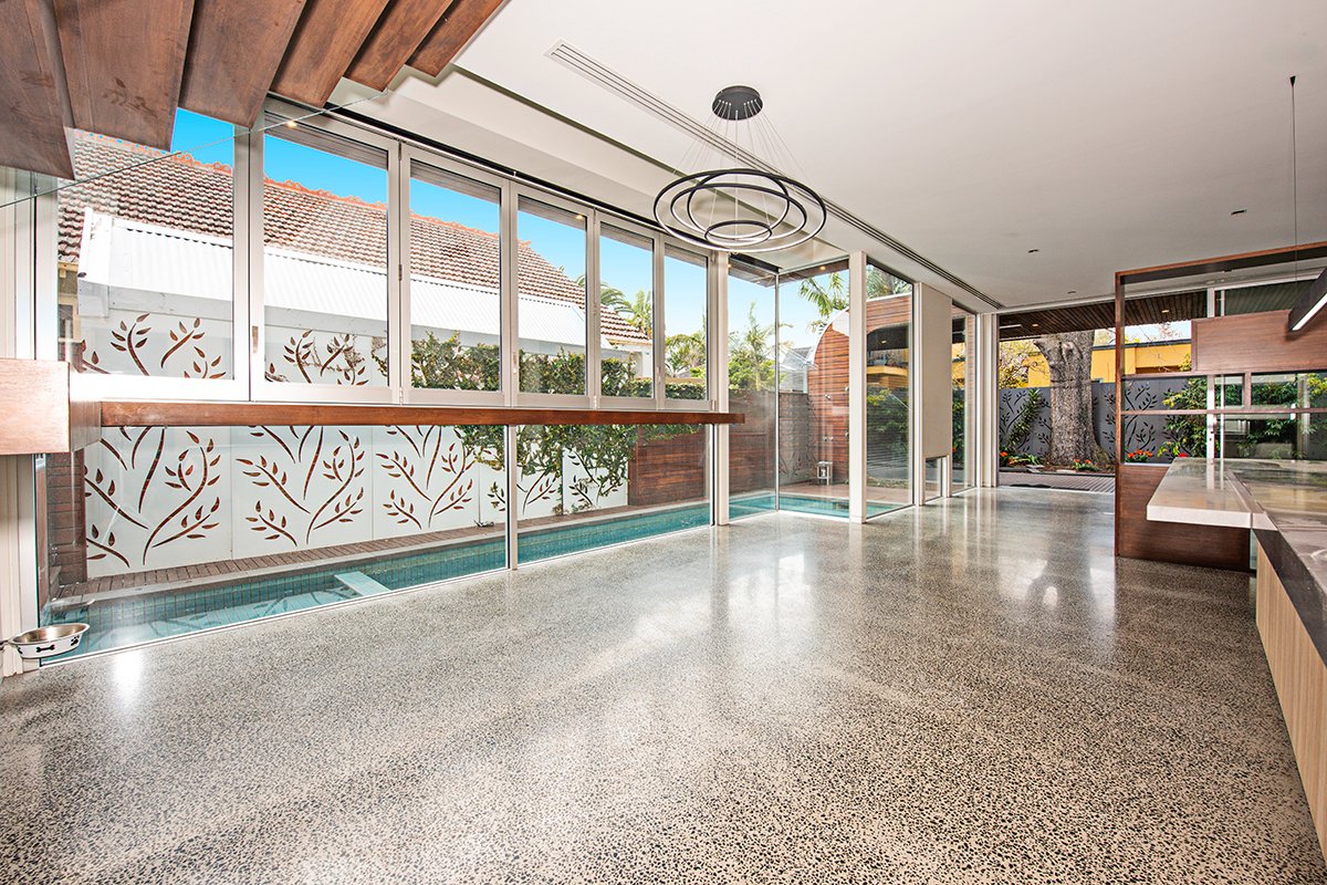 The property includes a wraparound pool, gas heating, pool maintenance included, a sleek curved deck, and hidden sliding doors, showcasing visionary living at its finest. A beautiful area for entertaining or just to enjoy from inside the house.