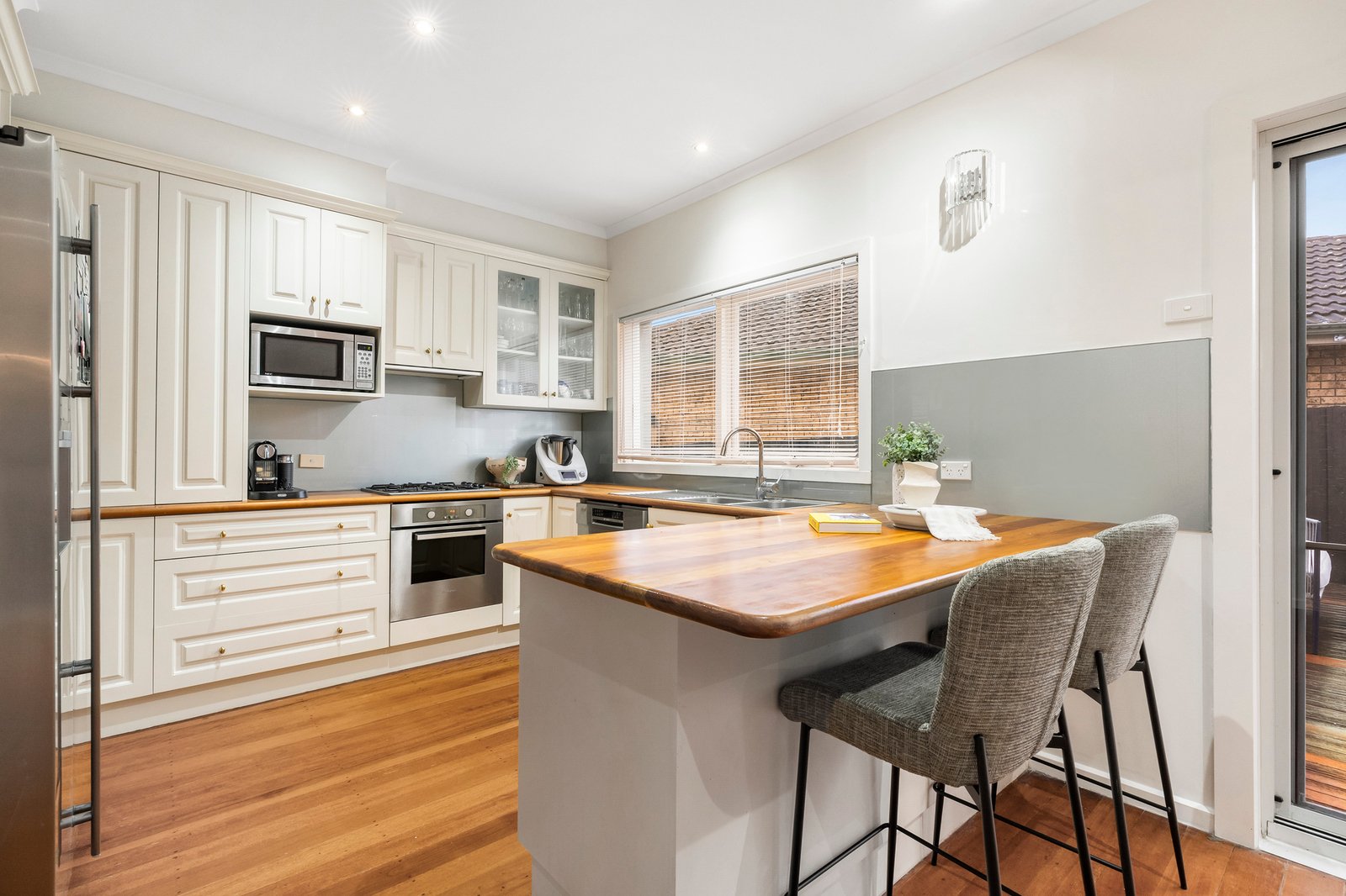 A country-style timber benchtop, Euro appliances, and a hideaway appliance cupboard create the ultimate cooking hub.