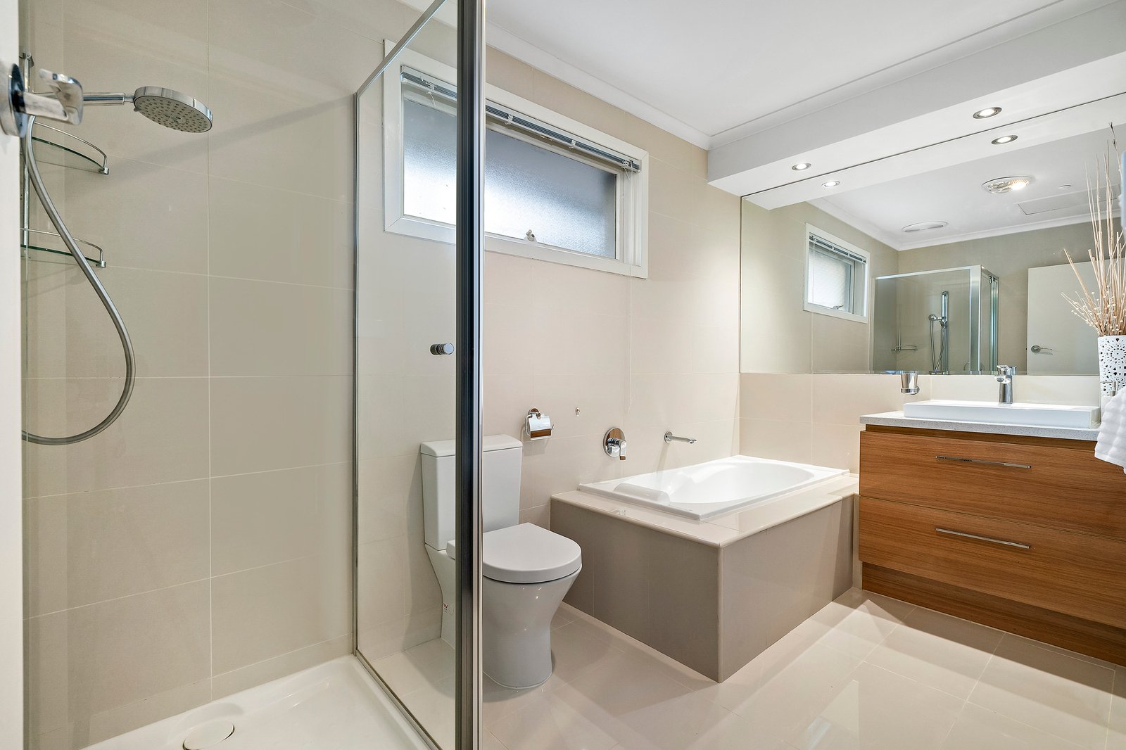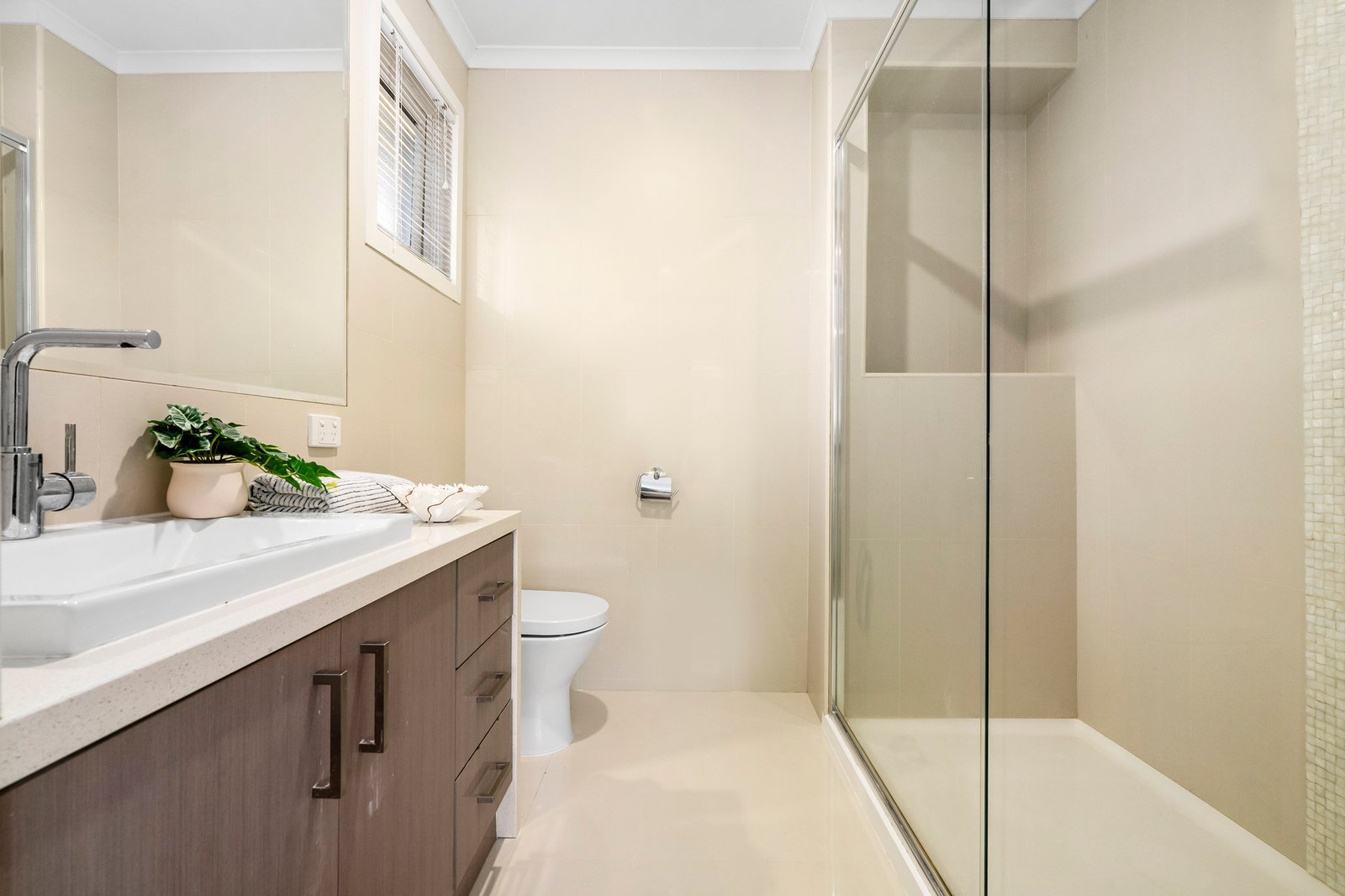 The upper level accommodates five bedrooms with lovely street frontage from the master bedroom, and two elegant bathrooms including an ensuite with a gorgeous pearl mosaic feature in the shower.
