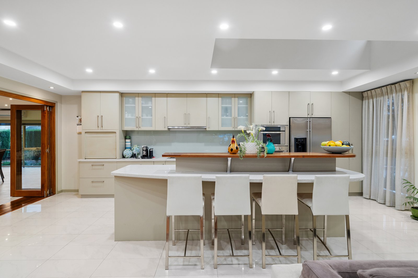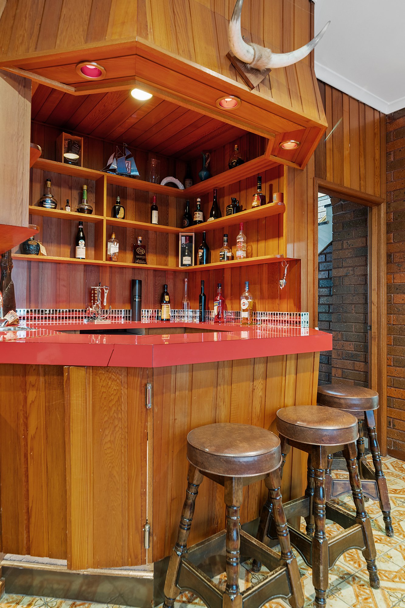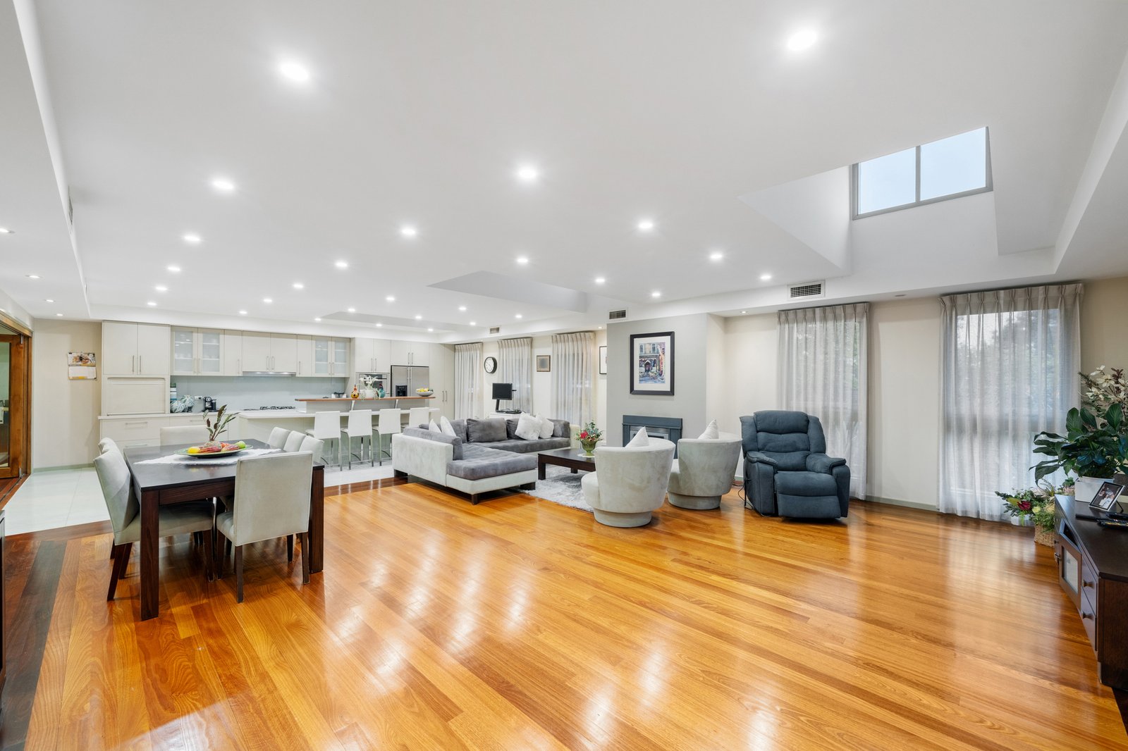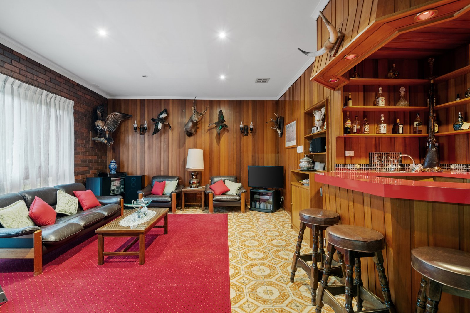 Enhanced by rich timber and accent windows through the expansive living/dining zone warmed by a cosy gas fireplace, the accommodation features an entertainer’s kitchen with quality appliances, ample storage and stretches of glossy stone. A bank of bi-folds connects this space with an oversized indoor/outdoor barbecue area creating a vast zone able to cater for the grandest family events, while a retro-cool family room complete with timber lining and a fitted scarlet bar gives hosts more options to gather with loved ones.