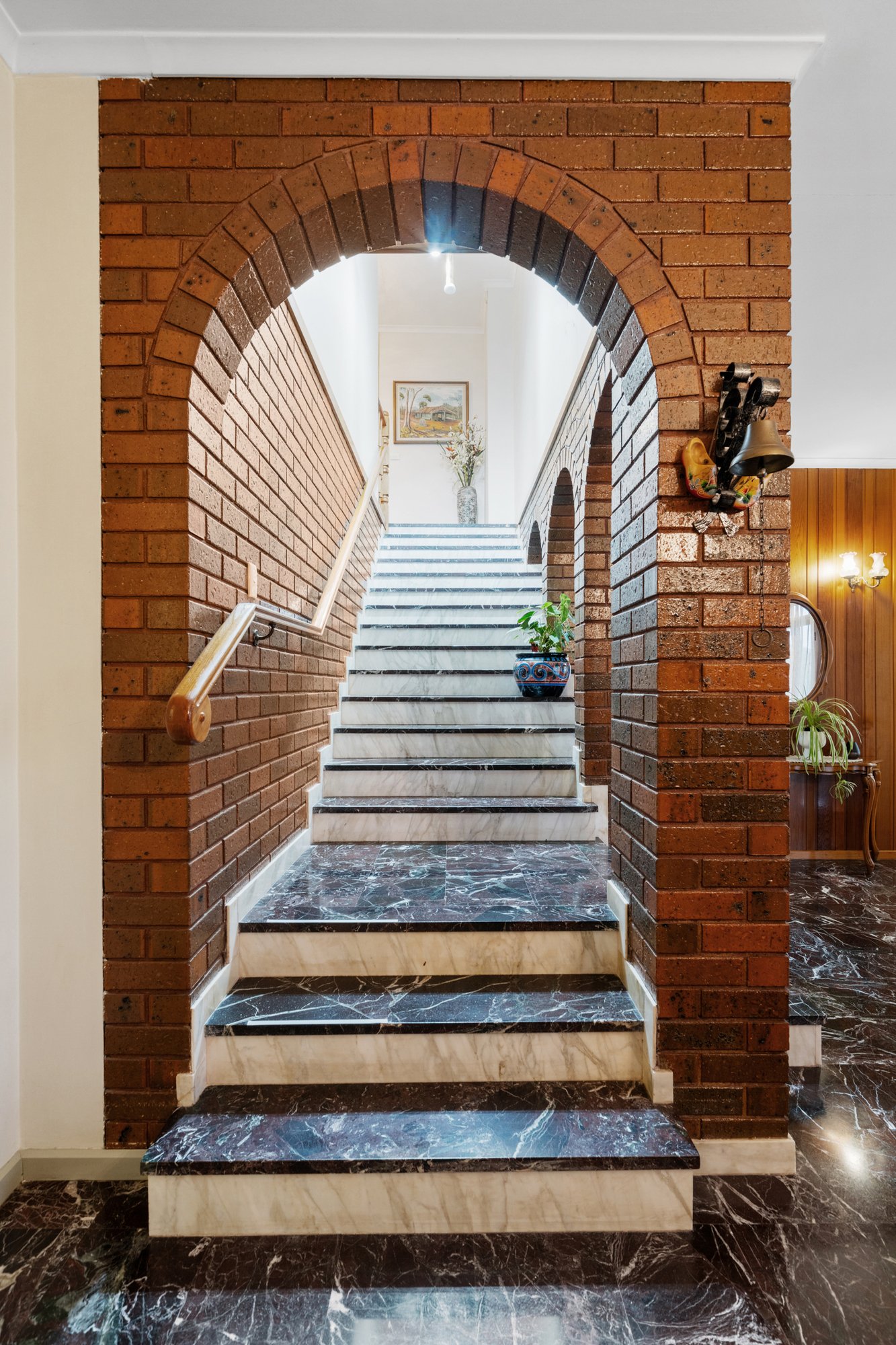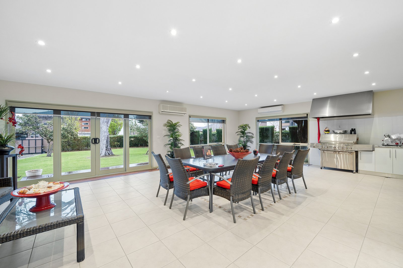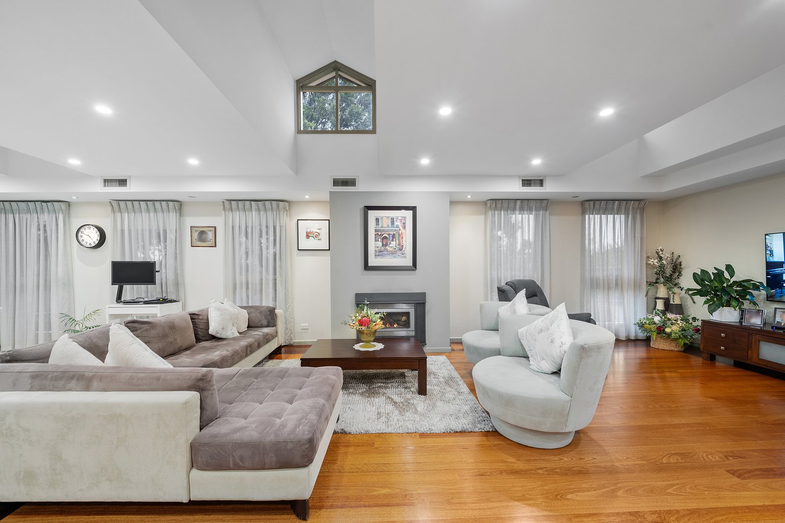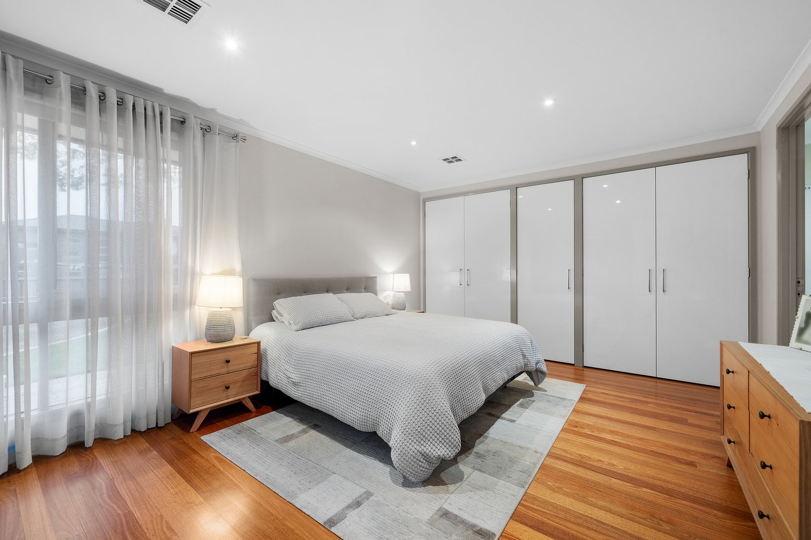 Enhanced by rich timber and accent windows through the expansive living/dining zone warmed by a cosy gas fireplace, the accommodation features an entertainer’s kitchen with quality appliances, ample storage and stretches of glossy stone. A bank of bi-folds connects this space with an oversized indoor/outdoor barbecue area creating a vast zone able to cater for the grandest family events, while a retro-cool family room complete with timber lining and a fitted scarlet bar gives hosts more options to gather with loved ones.