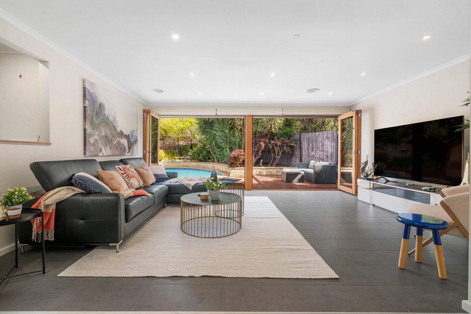 Designed for seamless flow around the main living wing – with bi-fold doors unfolding to the spectacular pool deck – there’s plenty of space for everyone, whatever your mood. Swim. Sunbake. Eat. Repeat.