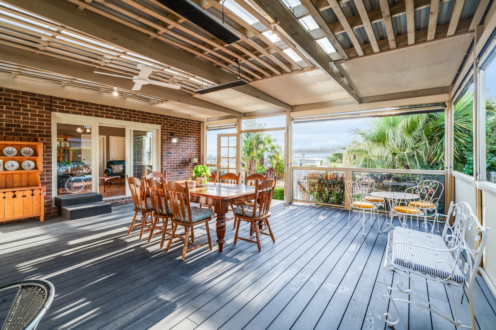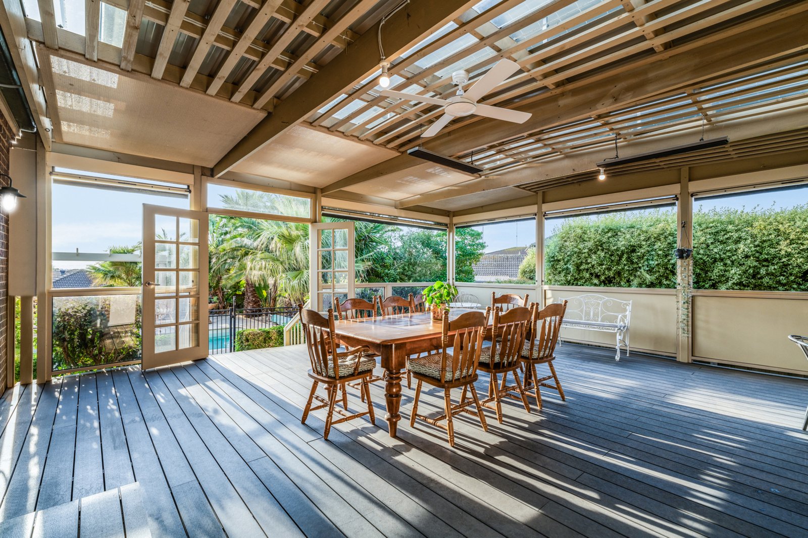 Outside, the luxury continues with an expansive undercover alfresco area, complete with overhead heating, outdoor blinds, and French doors leading to the pool. This versatile space is perfect for dining, lounging, or simply unwinding. The pool and spa, surrounded by Canadian palms and manicured hedges, offer a tropical oasis that’s solar and gas heated for year-round enjoyment. Beyond the pool, a lush lawn and gardens provide plenty of room for kids and pets to play, while raised vegetable gardens at the rear offer the perfect opportunity for home-grown produce.