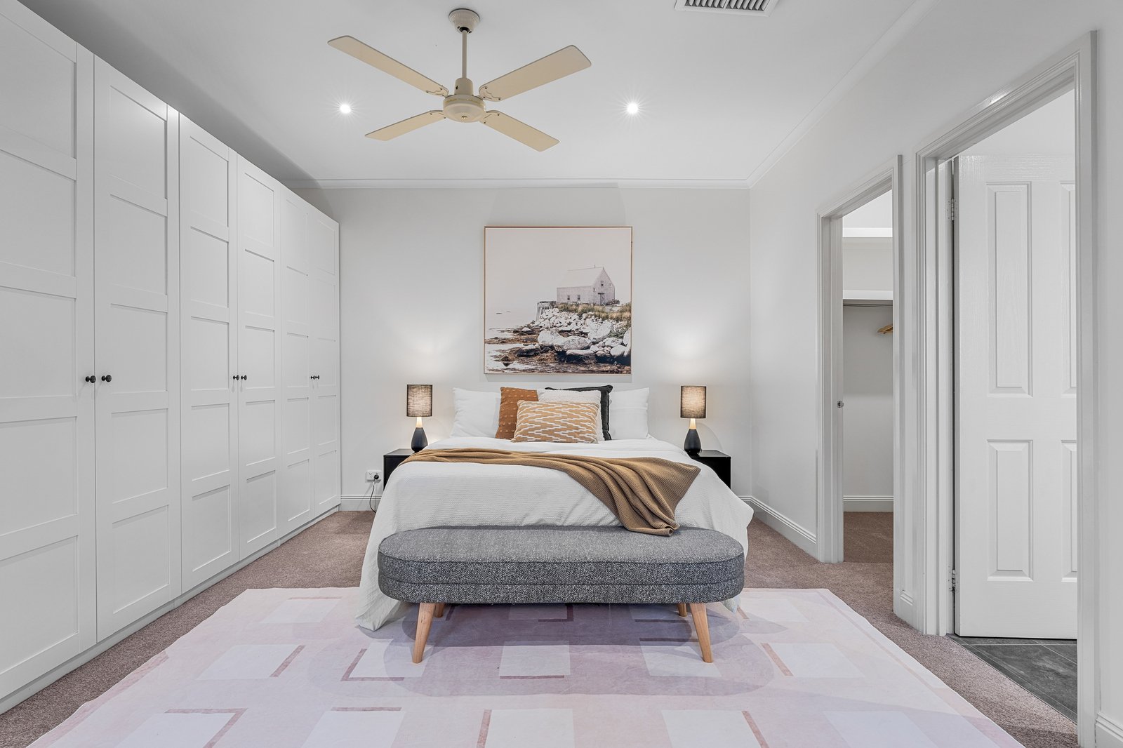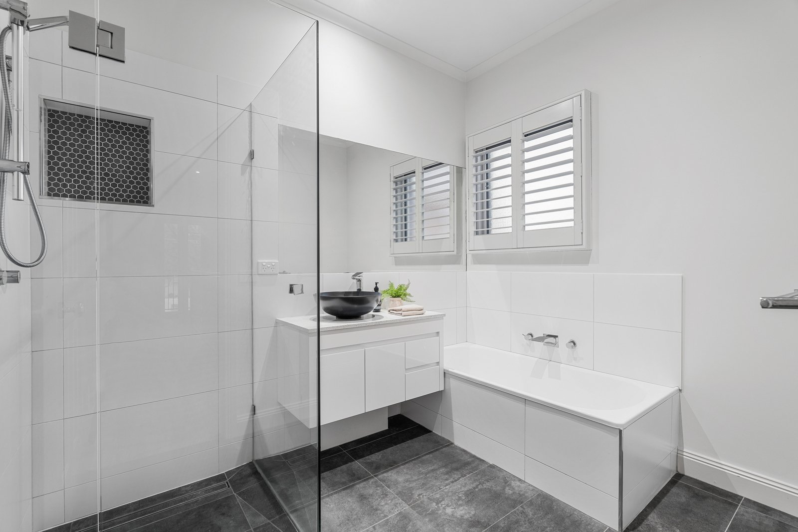 Ascending the staircase, one is greeted by three generously sized bedrooms. The master suite, a sanctuary of luxury, boasts an expansive walk-in robe and a sumptuous ensuite with dual vanities and a shower. The two remaining bedrooms feature ample built-in robes, while the family bathroom includes a bathtub, frameless shower, and vanity. The first floor also offers a splendid balcony, ideal for family relaxation.