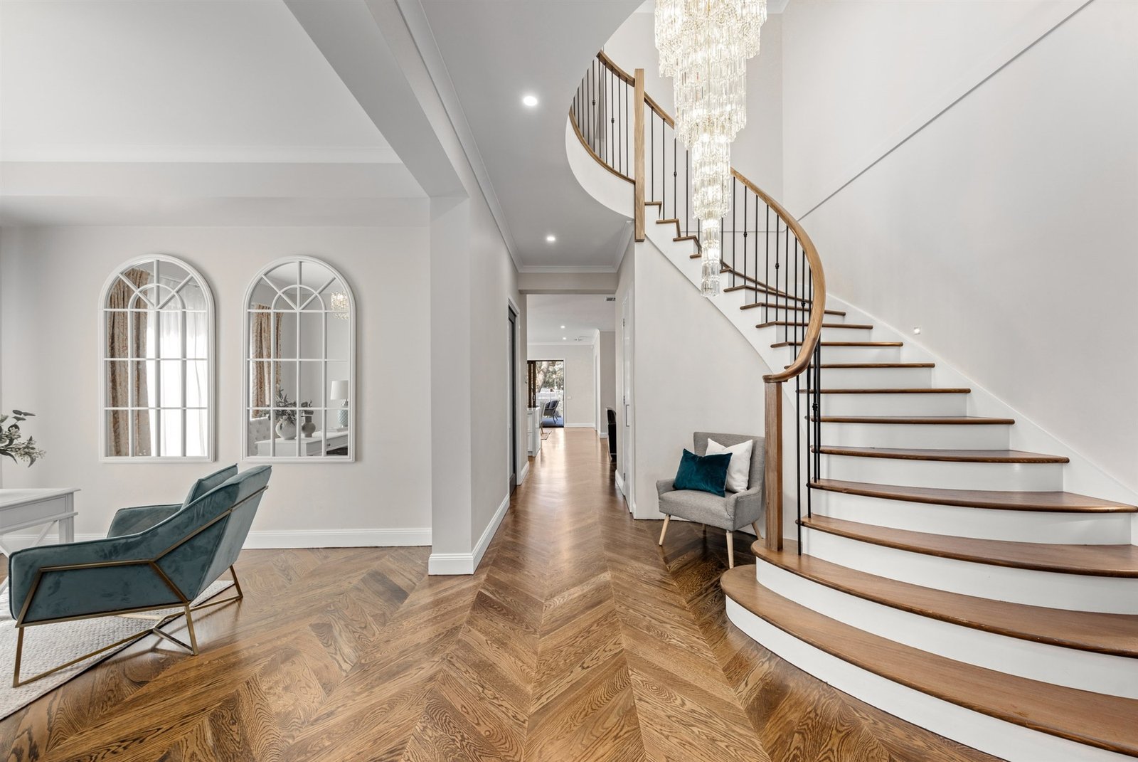 Nestled in the heart of Box Hill South, 45 Monash St is a French Provincial-inspired masterpiece, offering approximately 55 squares of luxury living. The home boasts five spacious bedrooms, each with its own ensuite, ensuring both privacy and comfort. Upon entry, the grand staircase and herringbone timber floors create an air of sophistication, flowing into a living area centered around an elegant fireplace. The master suite is a standout, featuring His and Hers walk-in robes, adding a touch of opulence to everyday living.
