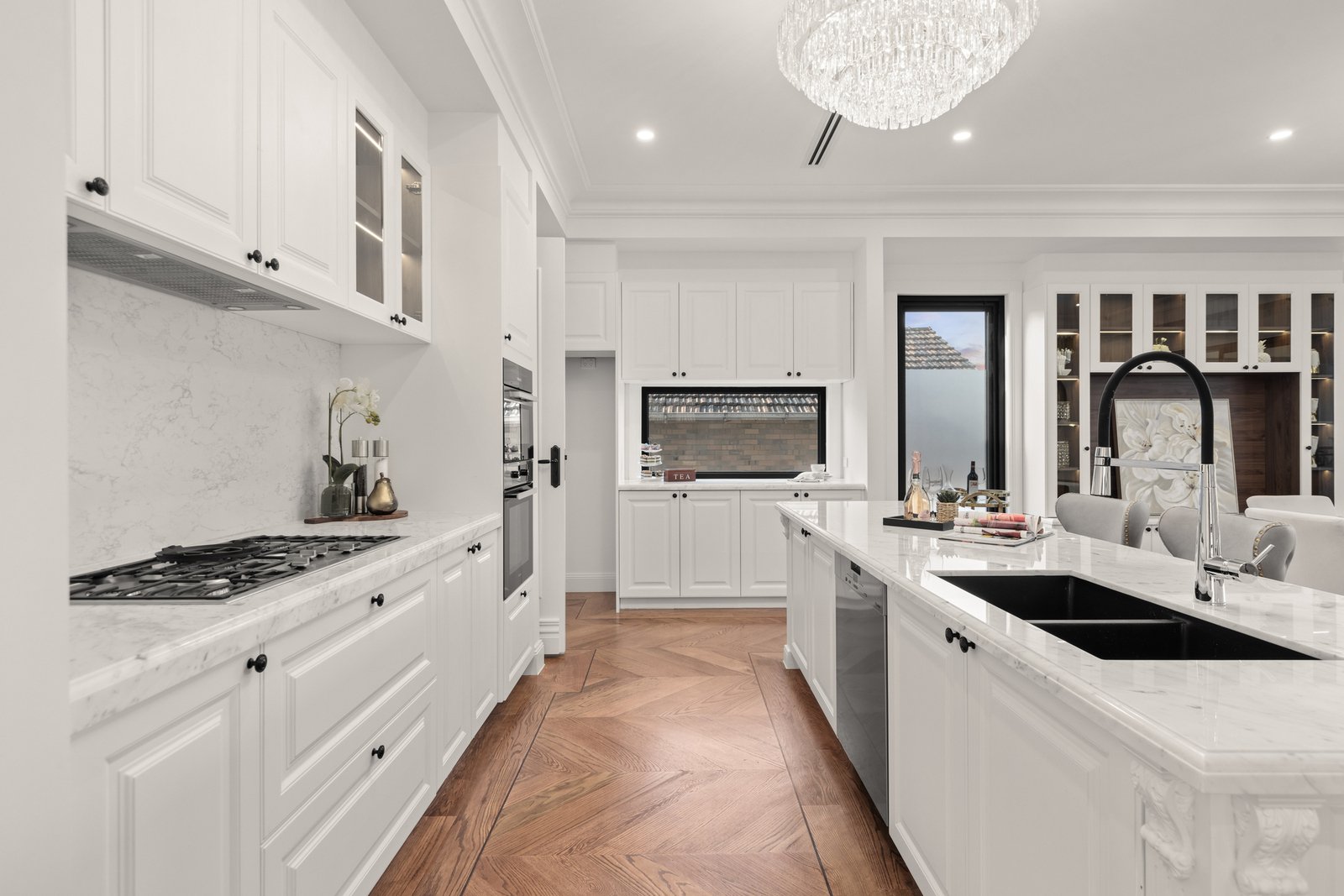 The heart of the home is the stunning gourmet kitchen, complete with premium appliances and a spacious butler's kitchen, ideal for preparing meals with ease while hosting gatherings of family and friends. Whether it's an intimate dinner or a lavish celebration, the kitchen's luxurious finishes ensure every occasion is a special one.