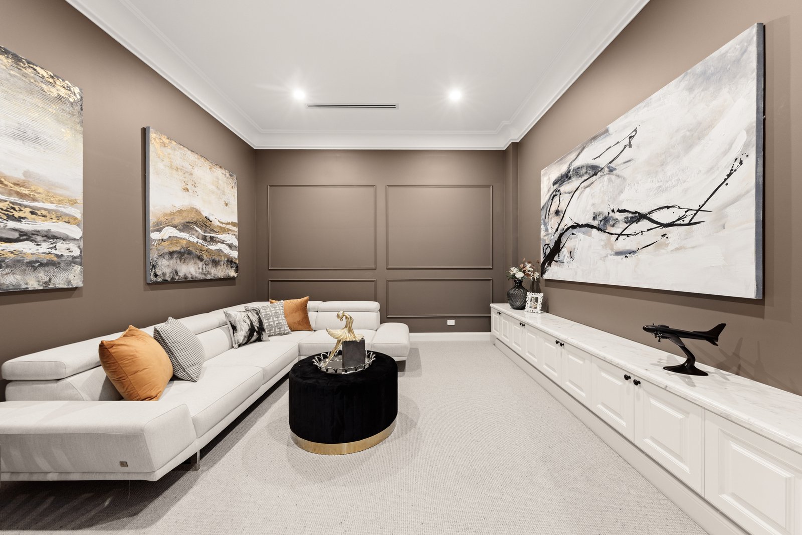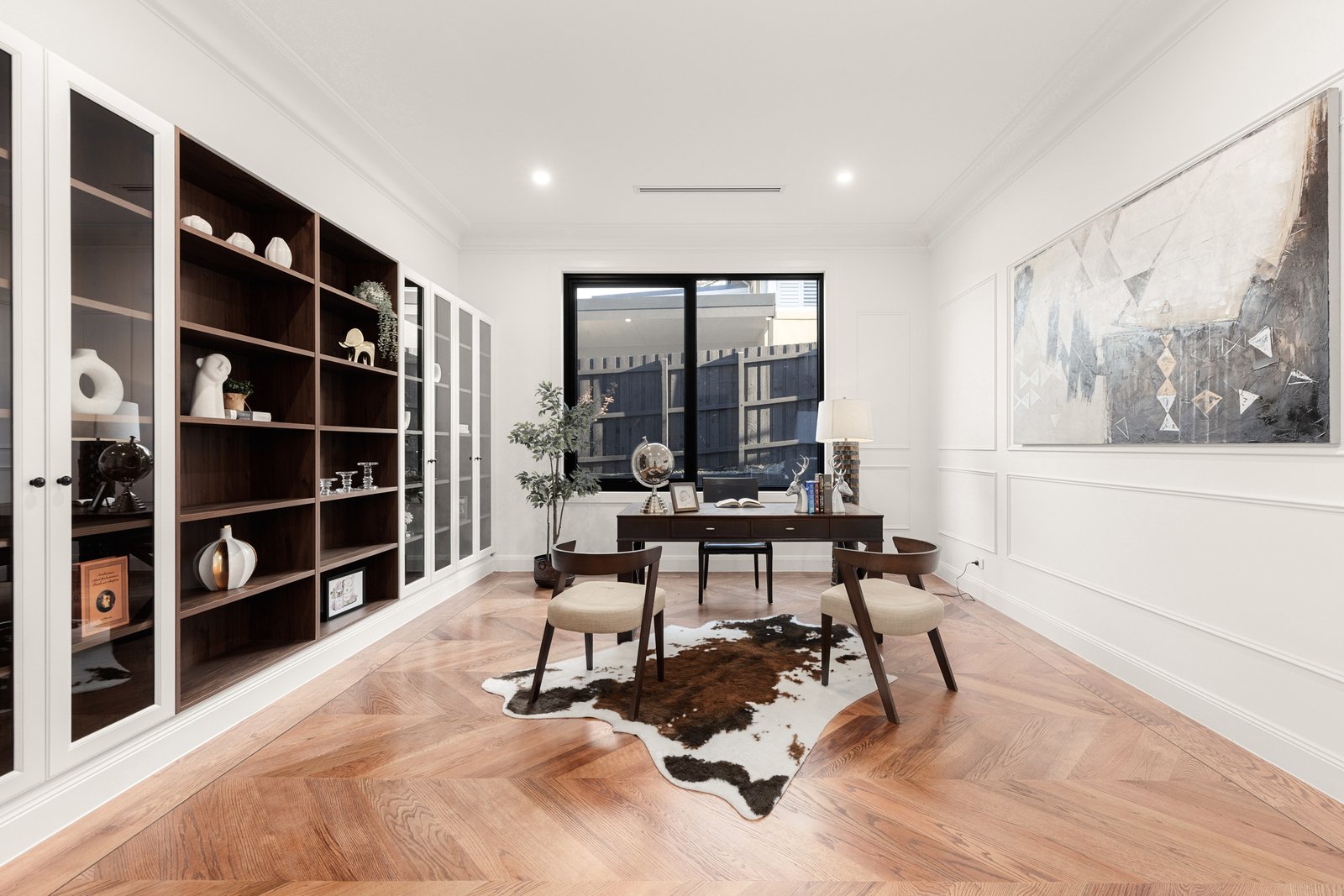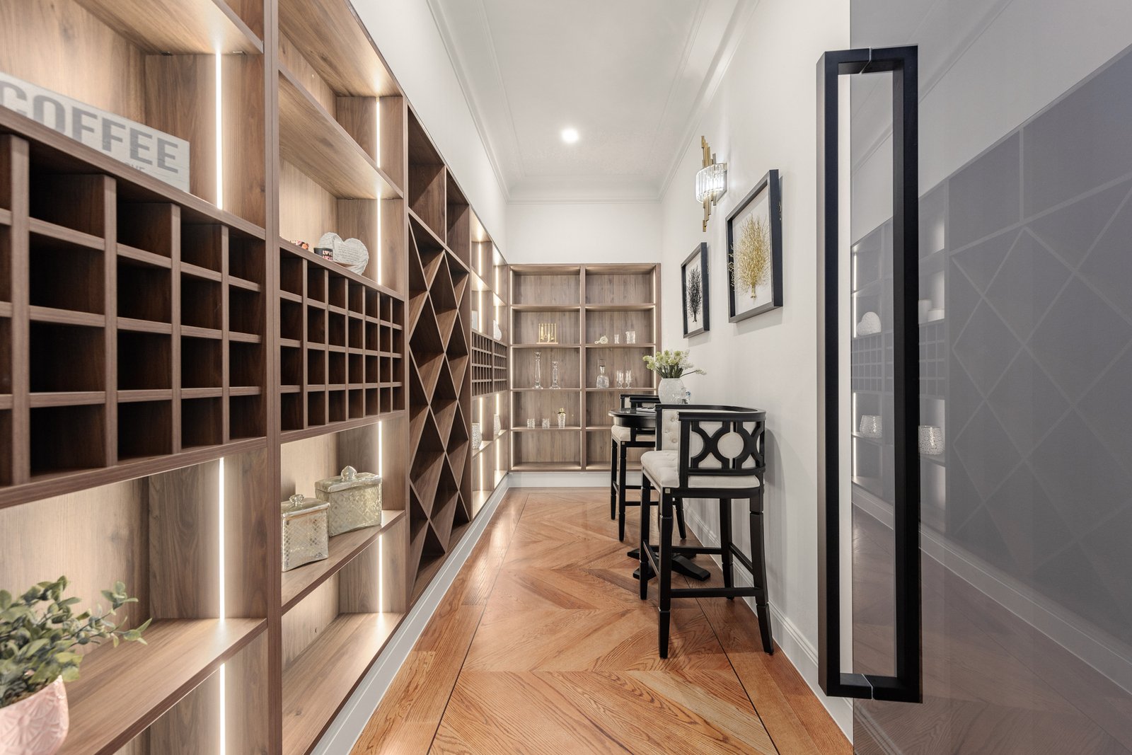 A seamless blend of form and function, the home features an array of thoughtfully designed spaces. A refined home office offers the perfect environment for productive workdays, while the cinema room promises endless entertainment in the comfort of your own home. The true centrepiece for wine enthusiasts is the custom-built cellar, featuring sleek shelving and an inviting tasting nook, creating the perfect setting to showcase a prized collection.