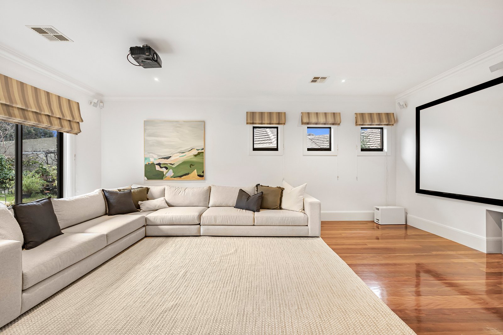 The versatile living arrangements feature a guest suite on the ground floor, complete with an ensuite, alongside five additional bedrooms (the master suite boasting a walk-in robe and private ensuite). An inviting teen retreat and family bathroom occupy the upper level, while an executive study, expansive refined living area with a gas fireplace, and open-plan casual zones—including a spacious Miele kitchen with a butler's pantry—enhance the allure for multi-generational leisure. A deluxe home theatre, equipped with projector and screen, further enriches this remarkable residence.