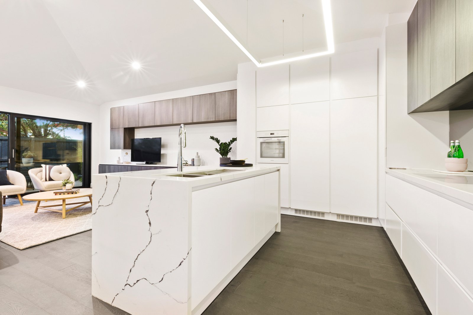 A unique circular hallway is a fitting prelude to the expansive open-plan living and dining, effortlessly spilling out through sliding glass doors to an alfresco deck for hosting unforgettable summer soirées or indulging in lazy Sunday barbeques. The kitchen is nothing short of spectacular, centred by a stunning marble-look island bench, paired with immaculate white cabinetry and high-end integrated appliances.