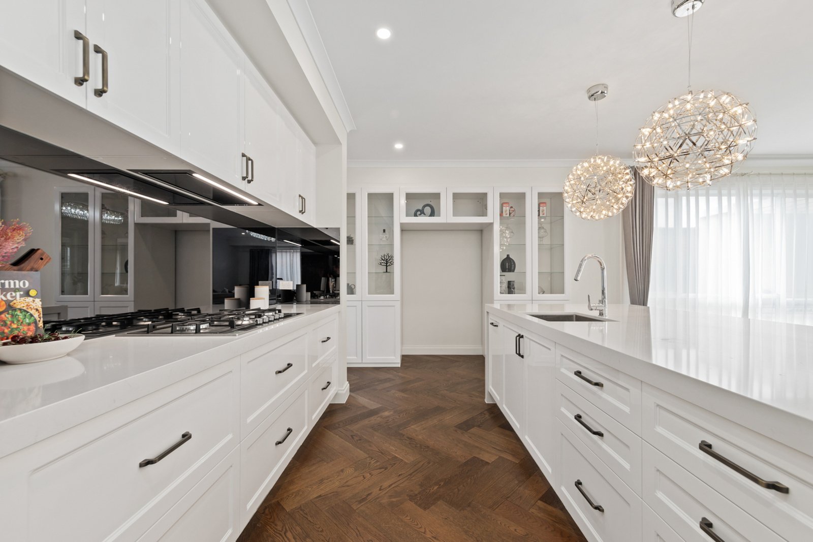 Gorgeous parquetry flooring anchors the open plan kitchen, dining and family room with quality finishes including stone benches, an island breakfast bench plus a butler’s/2nd kitchen that’s equipped with a 900mm oven and gas stove plus a dishwasher.