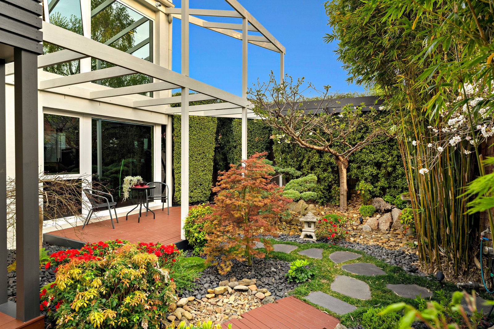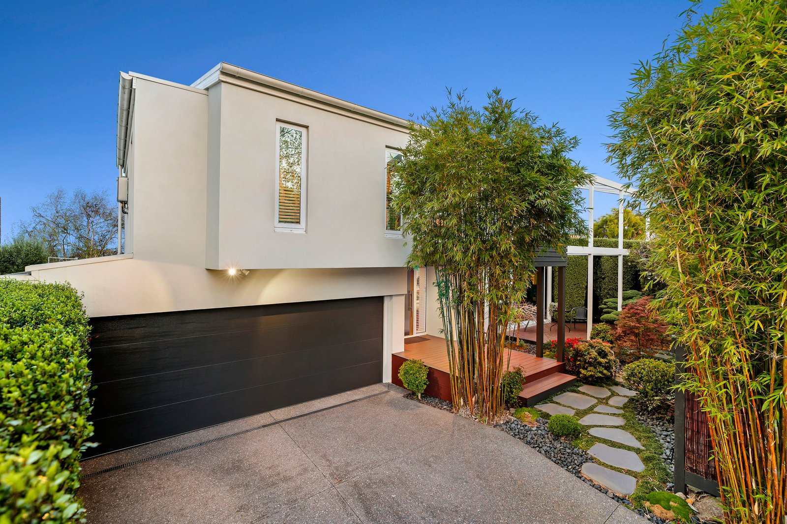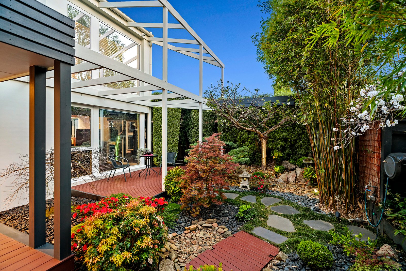 Dramatic ceilings and picture windows welcome glorious light into the soaring levels of the signature abode. Golden bamboo floors carry you through the walkways and living rooms. Clever zoning offers space in which to relax and retreat, enhanced by tranquil views of the stunning Japanese Gardens designed by bonsai master Jeff Barry of Chojo Nursery in Olinda.