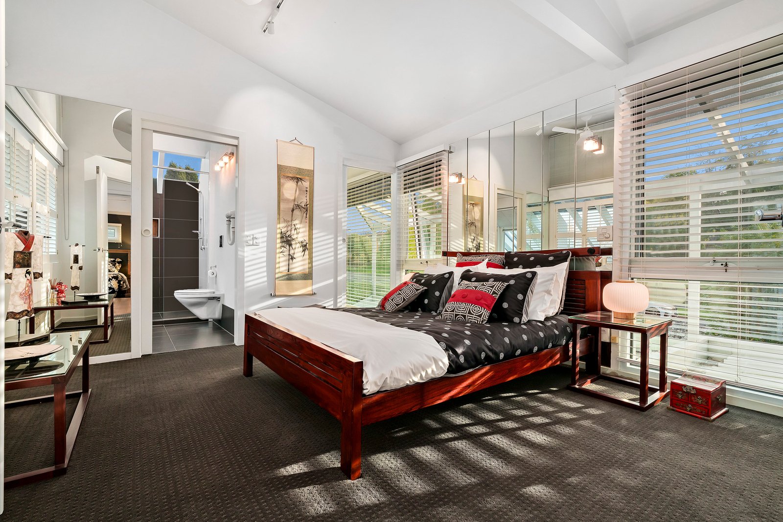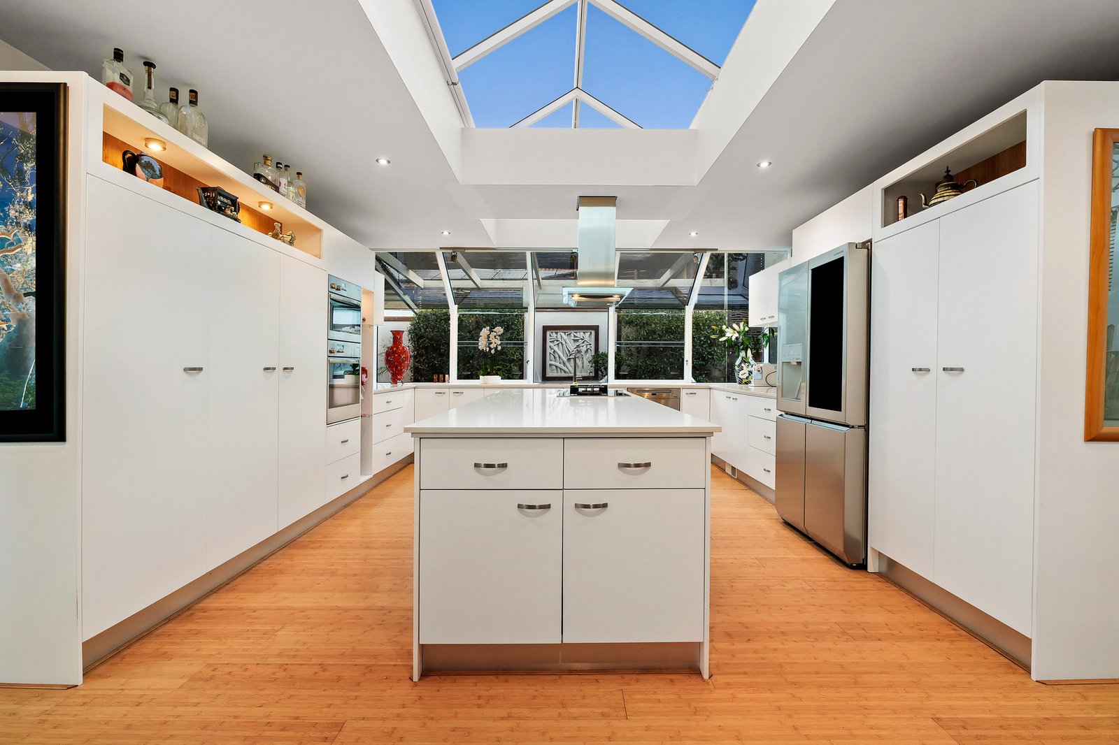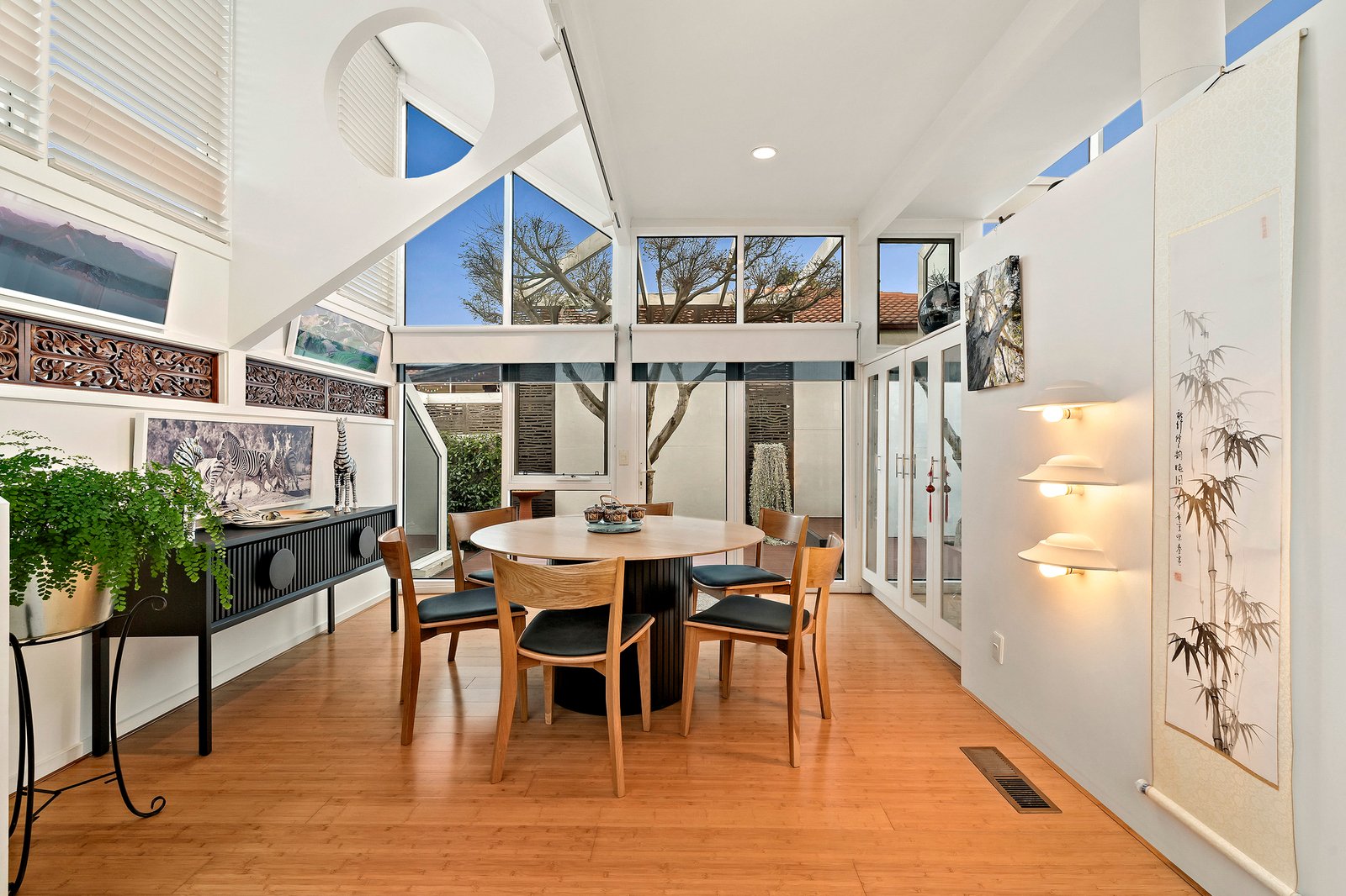 Dramatic ceilings and picture windows welcome glorious light into the soaring levels of the signature abode. Golden bamboo floors carry you through the walkways and living rooms. Clever zoning offers space in which to relax and retreat, enhanced by tranquil views of the stunning Japanese Gardens designed by bonsai master Jeff Barry of Chojo Nursery in Olinda.