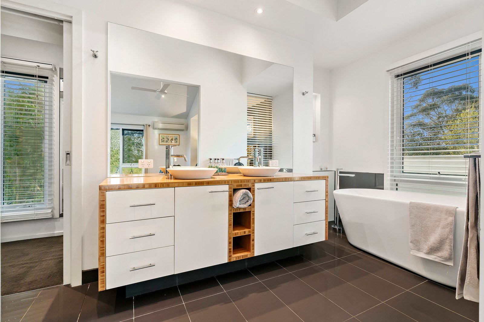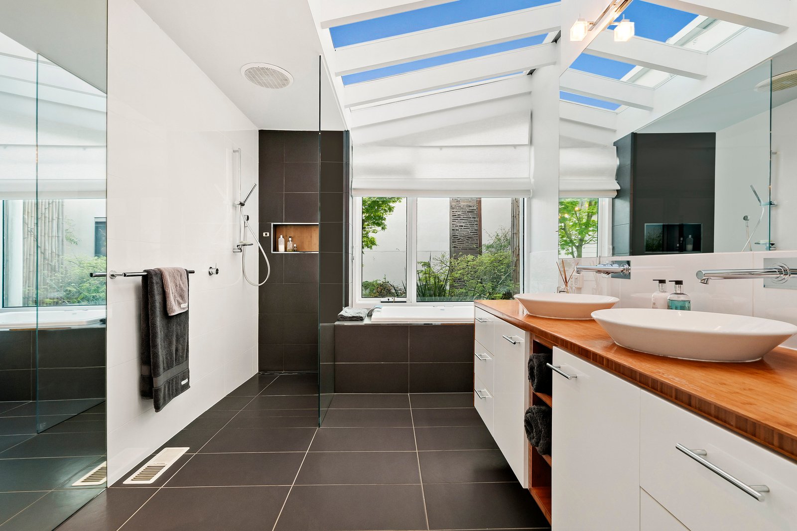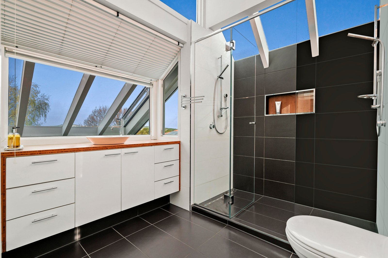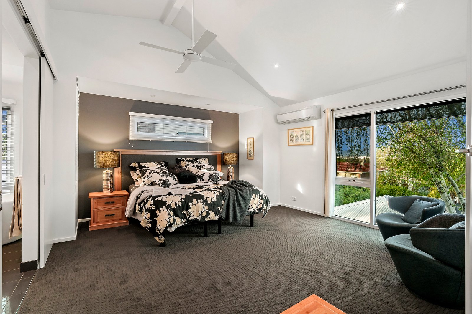 Bedrooms at either end of the home and the freedom of 3 bathrooms provide the utmost privacy for the family, and for guests. A spectacular sloping glass roof from the top level ensuite transforms The Dandenong Ranges into a postcard perfect view.