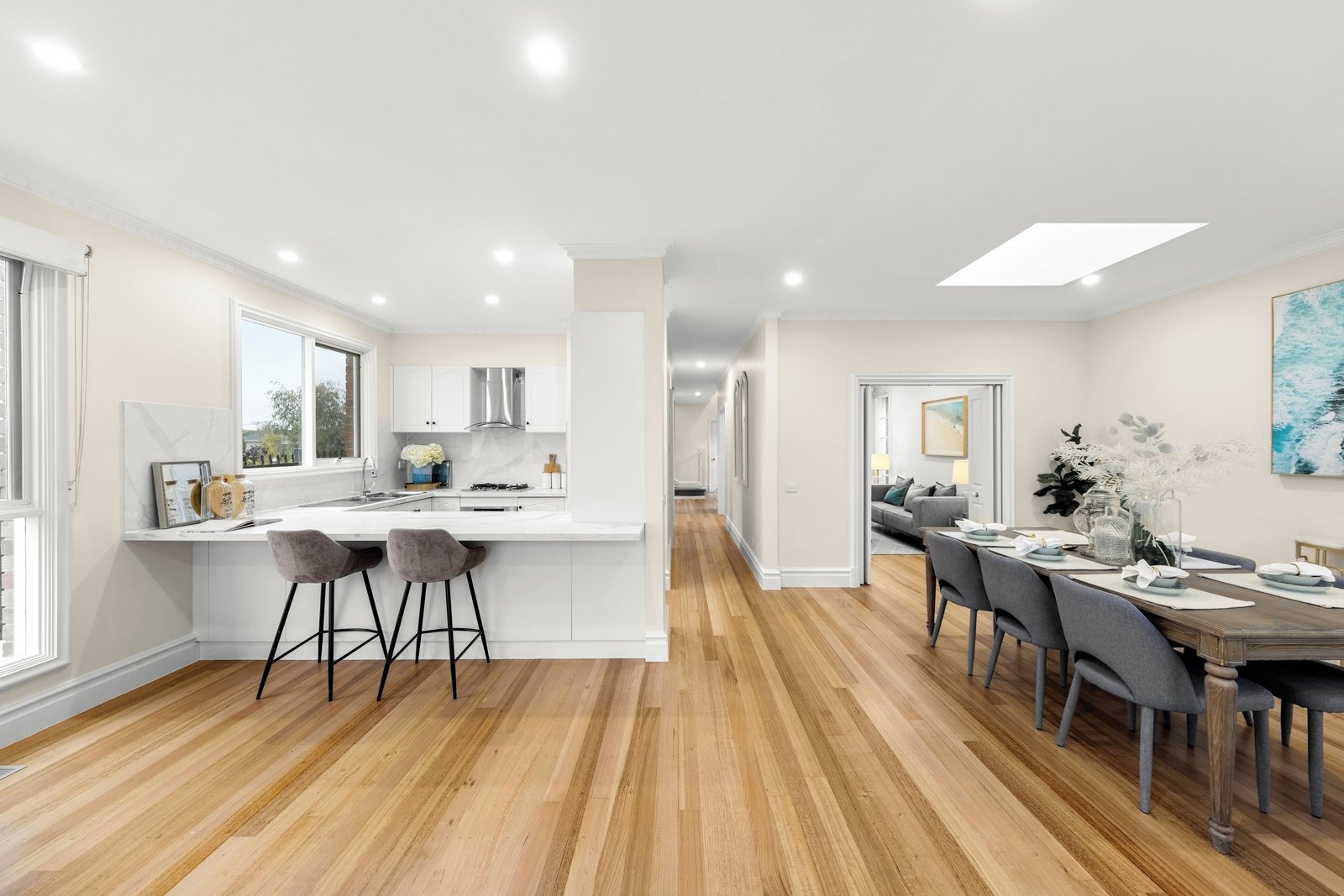 Family-focussed and flooded in natural light, the generous lounge room provides a restful retreat and can be closed off for privacy, accompanied by an open plan family room, dining zone and a gourmet stone kitchen appointed with premium Miele appliances.