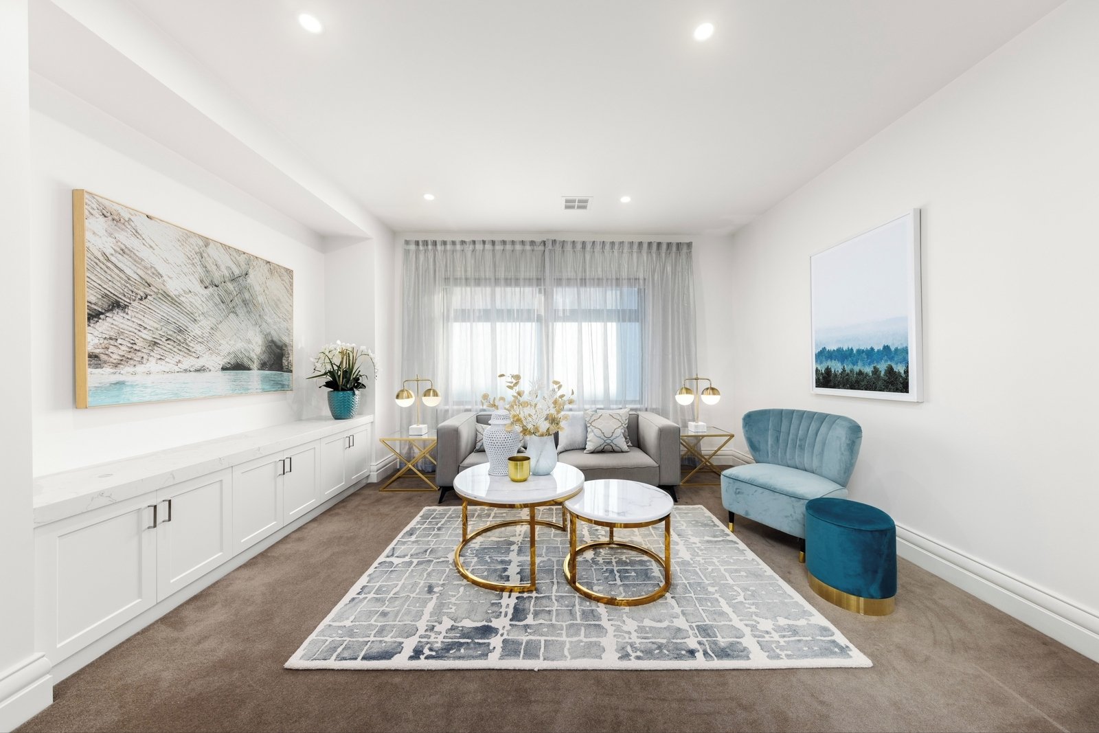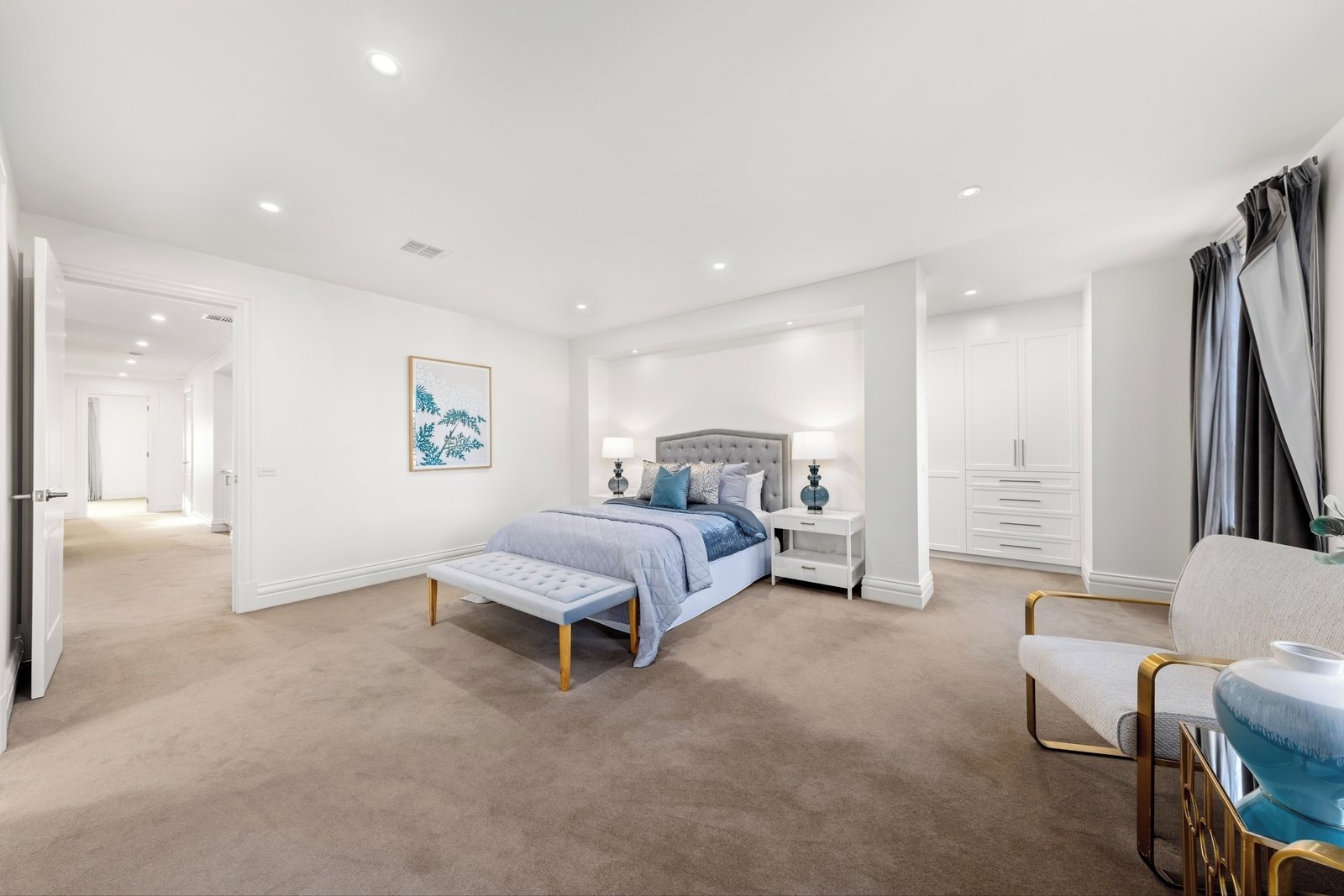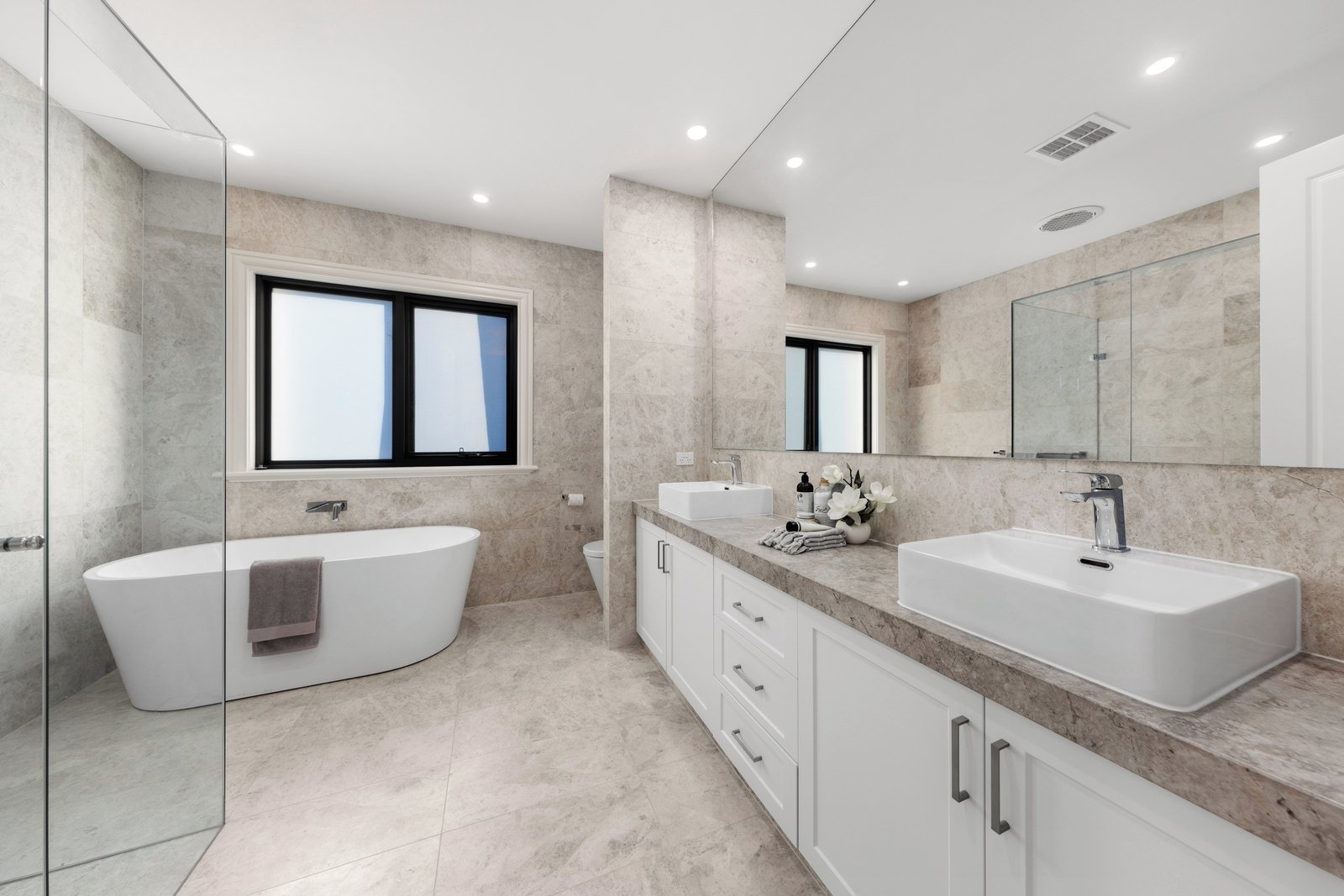 Continue through to an impressive family room, dining zone and a sublime kitchen boasting a full suite of high-end Miele appliances, thick stone benchtops and a butler’s pantry with a 3rd oven and a preparation sink. A guest bedroom with an ensuite is placed for convenience, matched upstairs by a comfortable retreat with a built-in storage unit and neighbouring bar/coffee station, and the indulgently large master bedroom featuring a Juliet balcony, large dressing room and exquisite ensuite finished with a freestanding bathtub, double rain shower and dual stone-topped vanity.