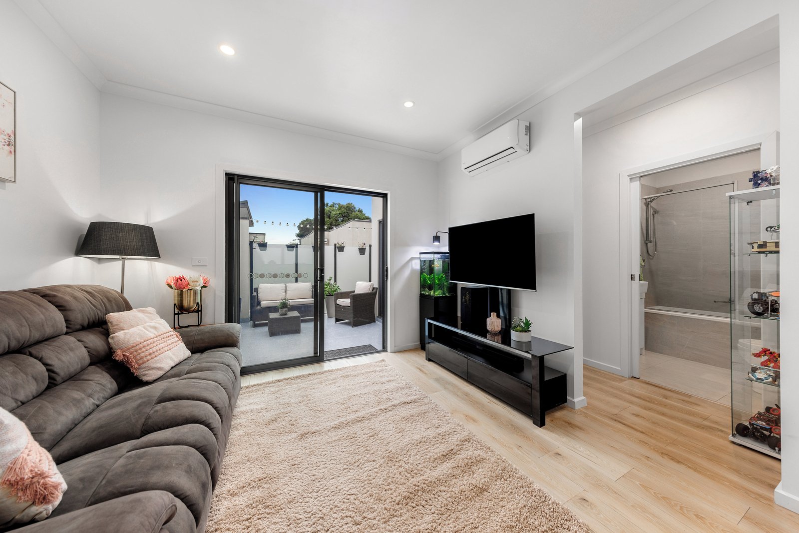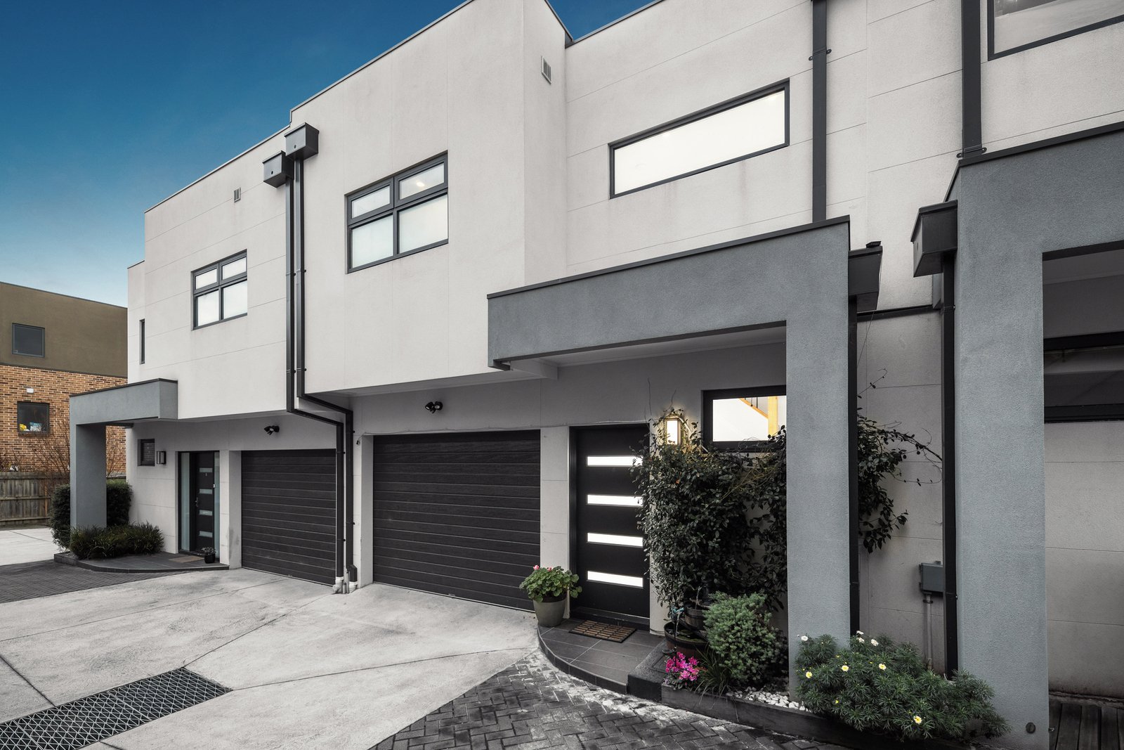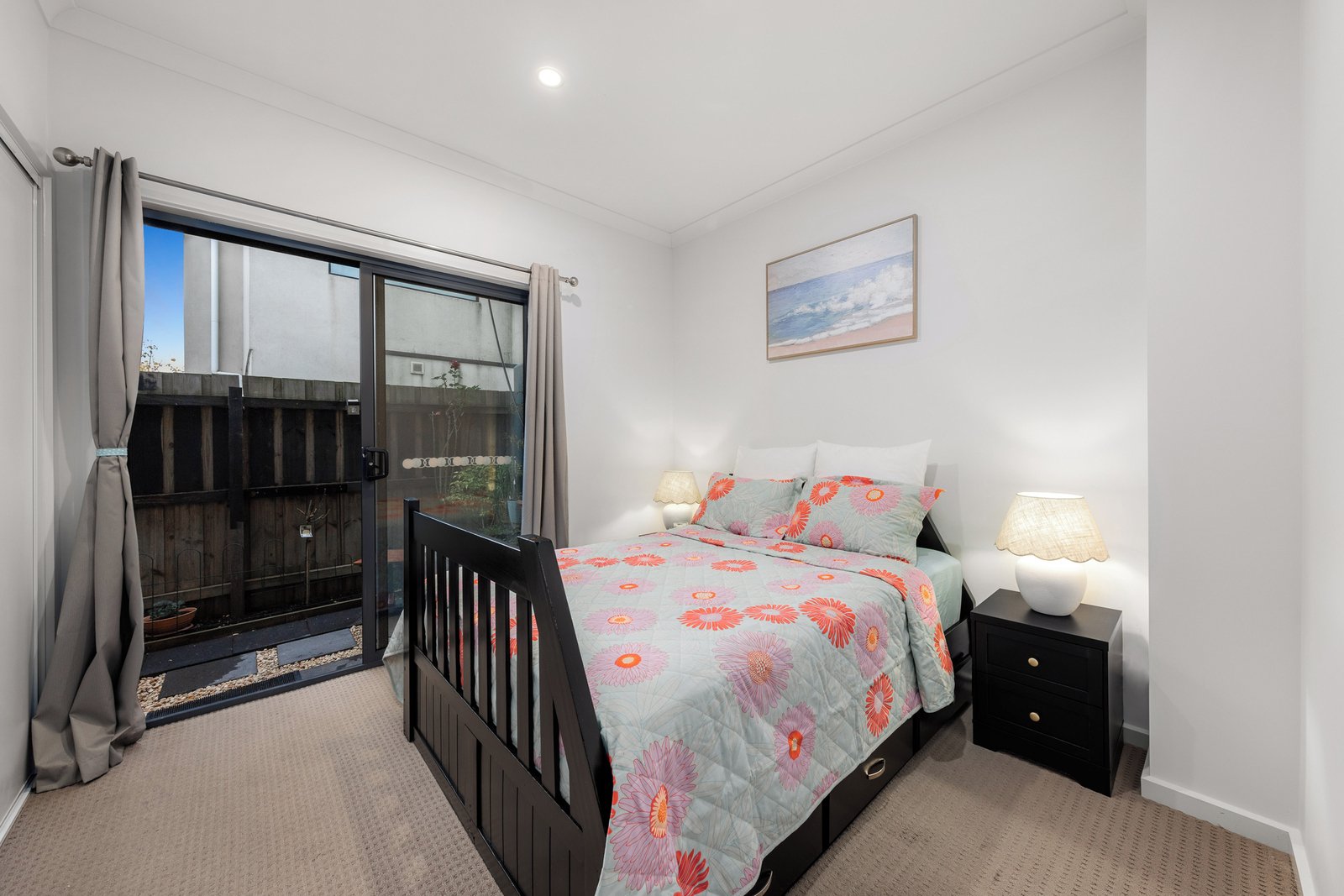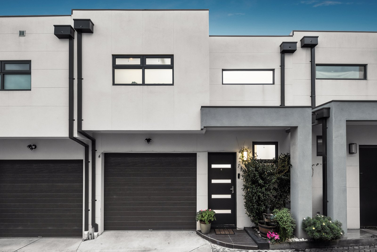Downstairs, the main bedroom boasts built-in robes, its own full bathroom, and sliding glass doors leading to a secluded, lush landscaped garden terrace. Additional amenities include four visitors' parking spaces, NBN internet, and reverse cycle split air conditioning for heating and cooling.