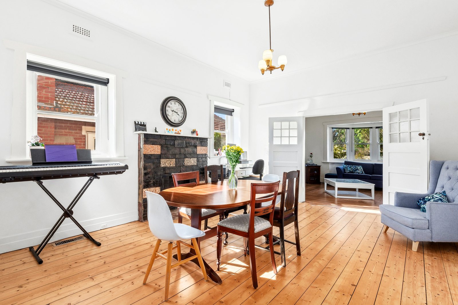 Built in 1928, the red brick bungalow façade features a grand veranda and leadlight windows, showcasing the original character of the home. Inside, a wide entry hall introduces high ceilings, crisp white interiors, polished timber floorboards, and a stunning hallway arch creating an impressive welcome within. The formal lounge at the front of the home features a beautiful bay window with a picturesque garden outlook, and double doors leading through to the adjoining dining room. Both rooms feature brick mantels and fireplaces, with central ducted heating throughout catering for your modern comforts. At the rear of the home, the well-appointed kitchen features quality stainless-steel appliances including 600mm oven, gas cooktop, dishwasher, ample bench space, generous storage, and is well-positioned to access the dining room for effortless entertaining.