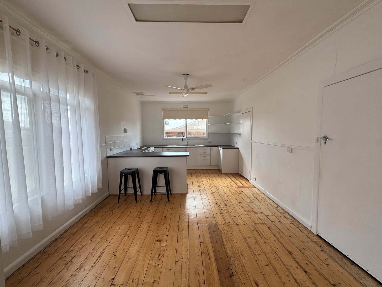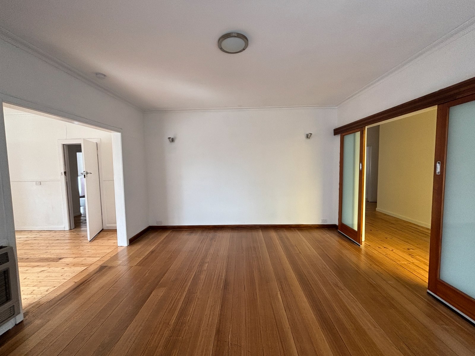 * Large open plan living area with polished timber flooring, and flow through access to the kitchen and dining area