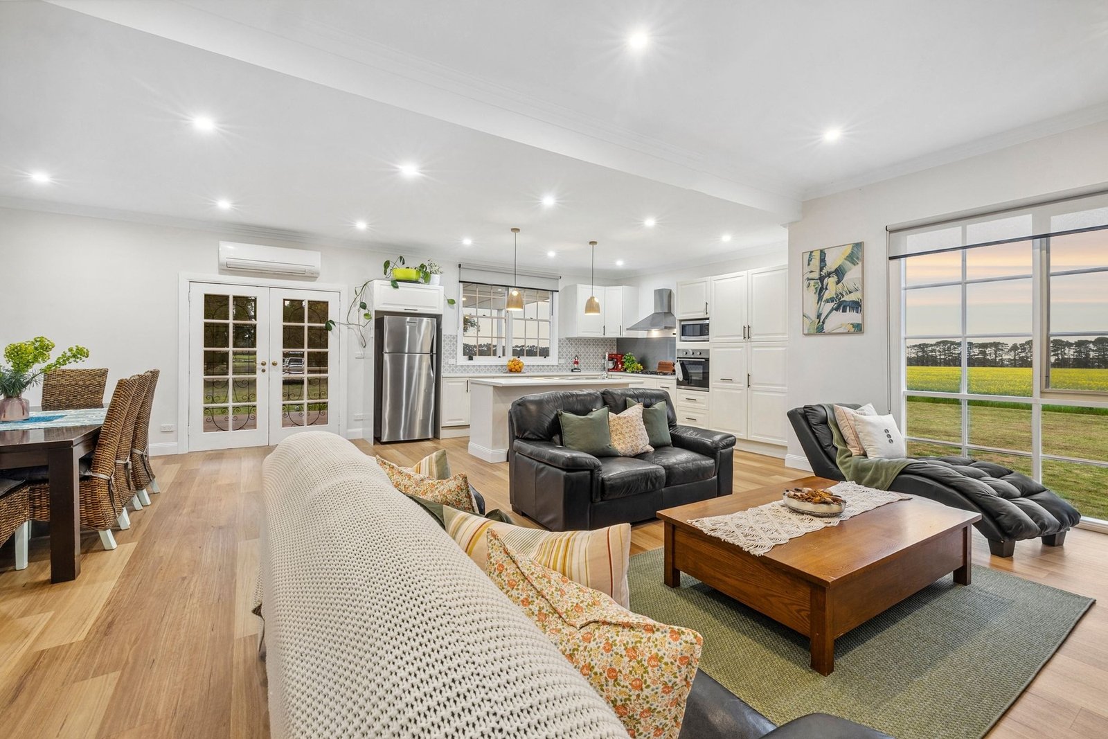 At its heart is a lovingly restored 100-year-old weatherboard homestead, rich in heritage charm and updated with all the comforts of contemporary living. The home features three bedrooms plus a study, a beautifully appointed Hamptons-style kitchen, and a generous open-plan living space that spills out to a large deck perfect for soaking up the panoramic views of rolling crop fields and open skies.