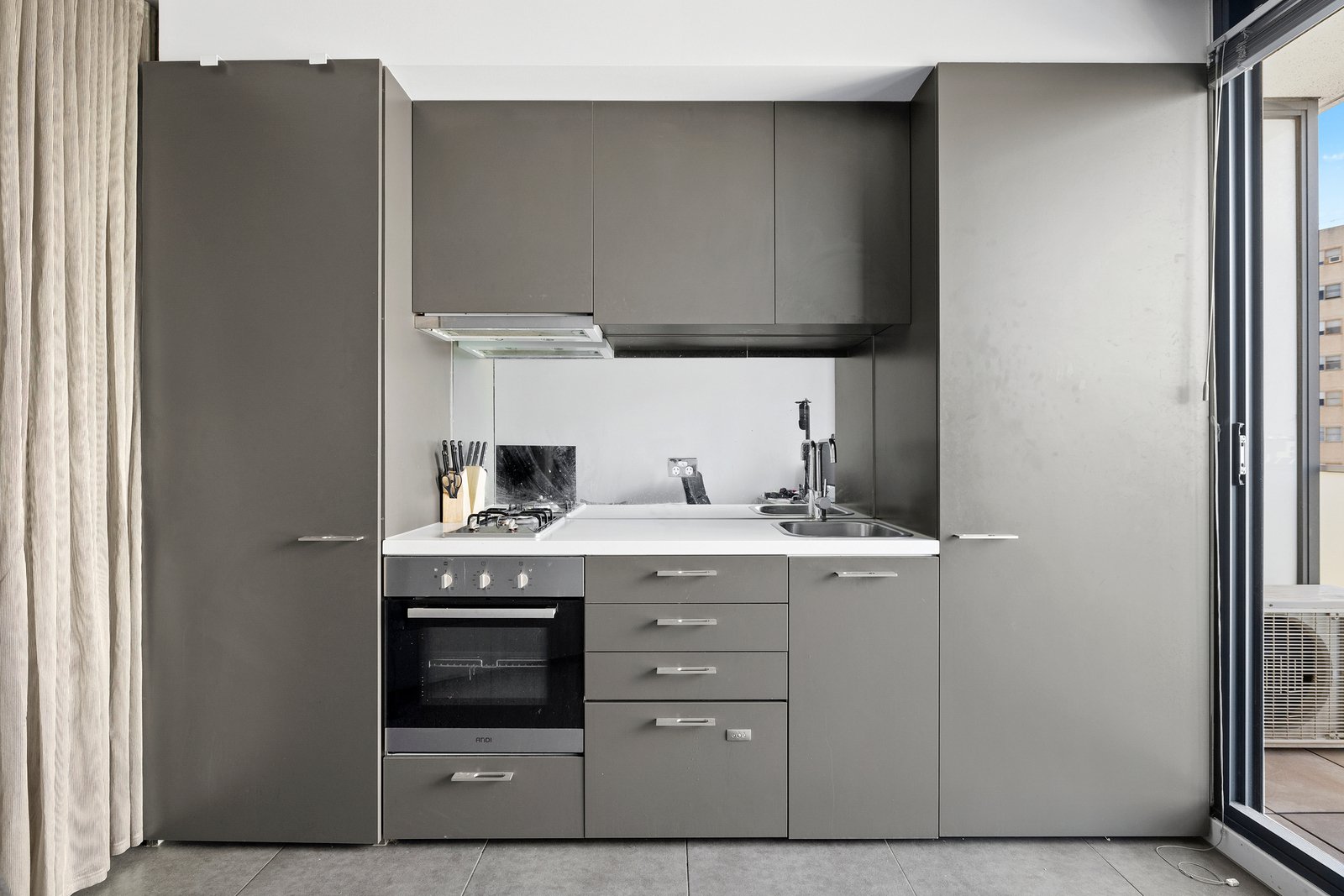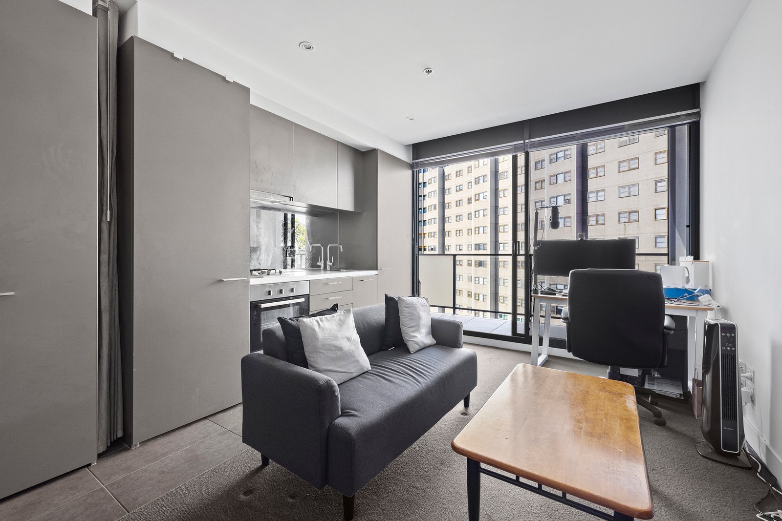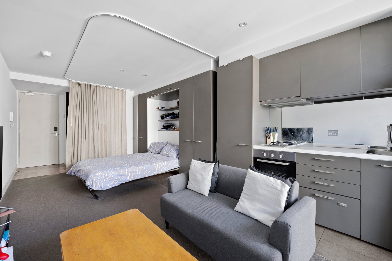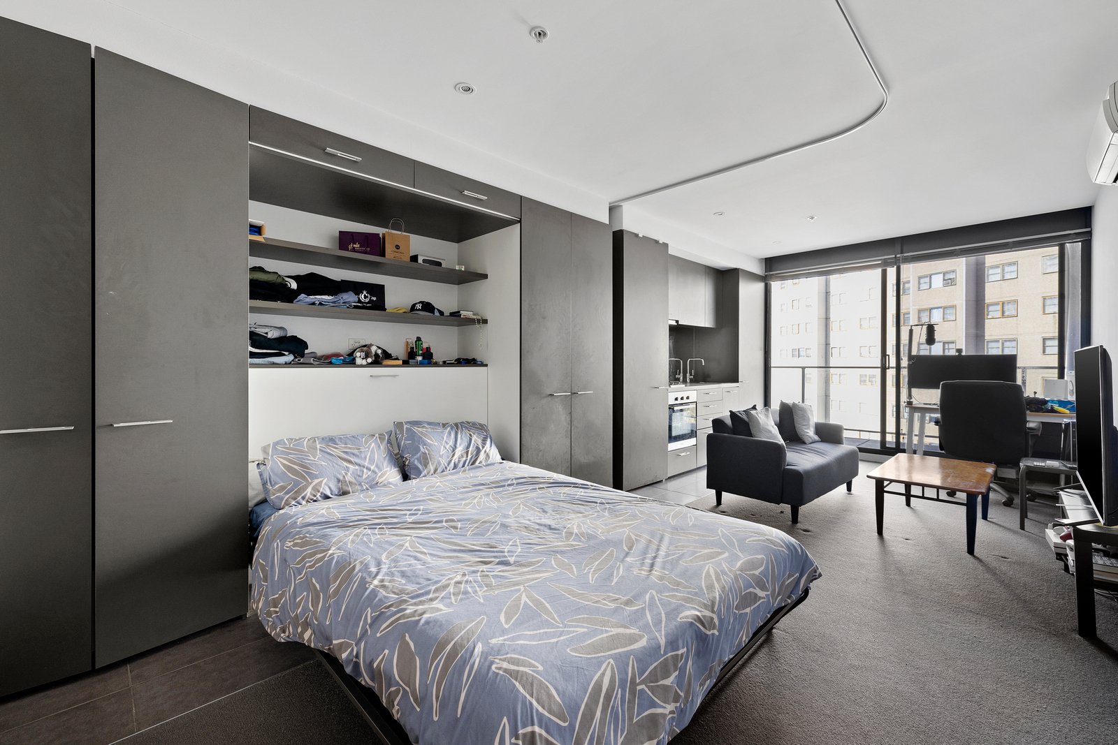 Accessible through a secure entry and elevator, the studio residence features an open-plan living and bedroom area with a wall of floor-to-ceiling windows opening onto a spacious balcony for panoramic views. The kitchen is adorned with stone countertops, stainless steel appliances (including gas cooking), and a dish drawer, complemented by a mirrored splashback. A cleverly wall-mounted bed and storage provide flexibility to maximize space during the day and ensure comfort at night, all serviced by a modern monochrome bathroom with a walk-in shower. Additional amenities include a Euro laundry, reverse cycle air conditioning, secure video intercom entry, within a building offering luxurious lifestyle choices such as a rooftop terrace with a lounge area, gym, and an on-site building manager.
