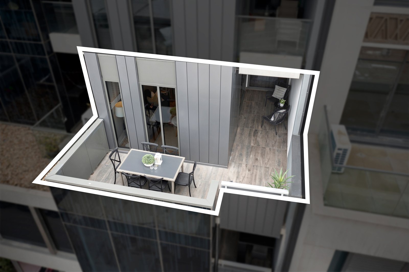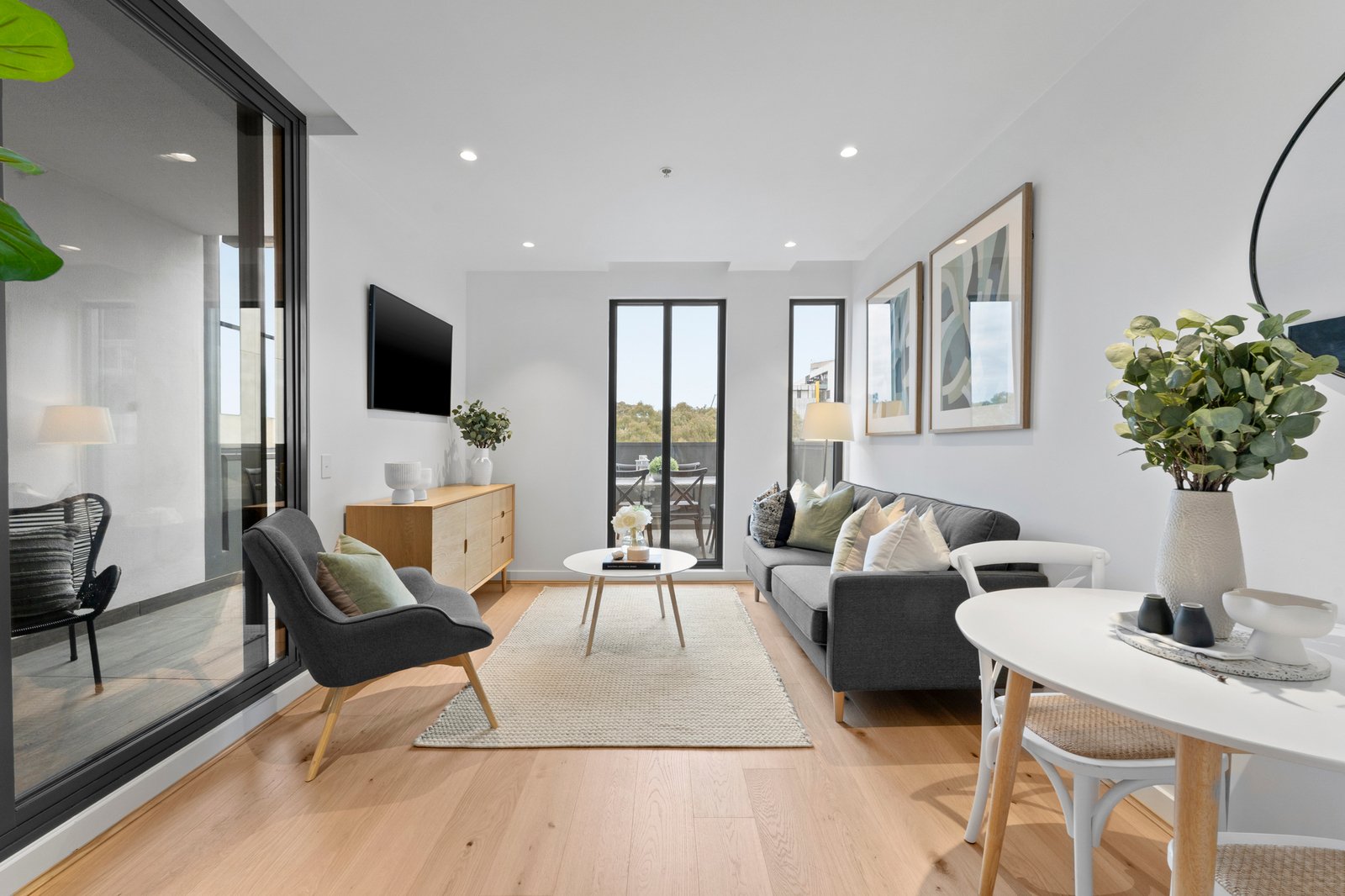 • Light-filled open living opens to private wraparound balcony
