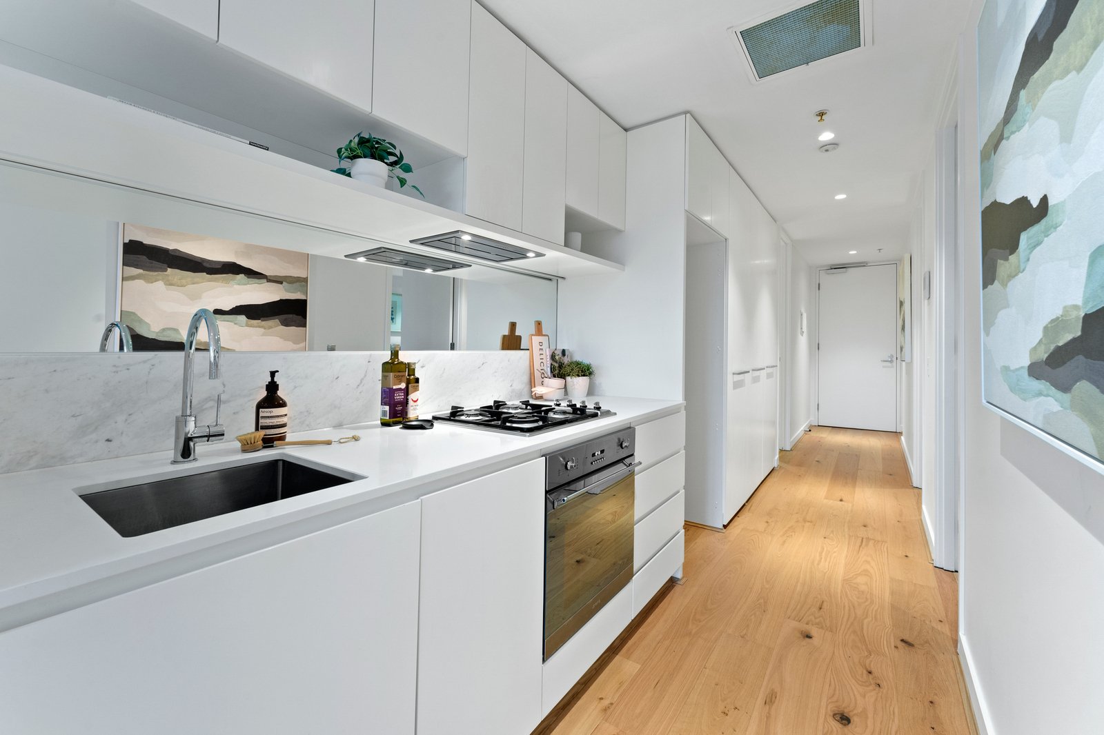 Beautifully appointed throughout, the apartment feels luxurious from every angle, from the stylish floorboards and plush carpets to the contemporary colour scheme. Gourmets will relish the quality stainless steel appliances, integrated dishwasher, soft close cabinetry and mirrored splashbacks within the deluxe stone kitchen, while the balcony offers ample space for entertaining and barbecues, backdropped by a colourful elevated outlook. Within the complex there is a shared rooftop terrace with stunning city views, plus heating and cooling, and secure entry, car space and storage for convenience.