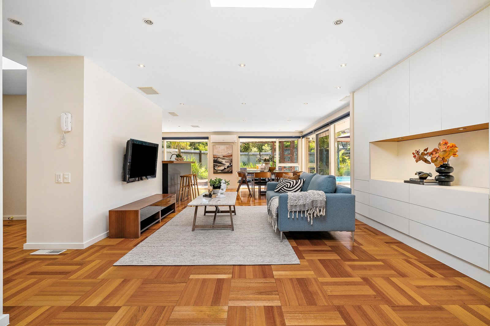 A celebration of light and space, the designer residence enjoys a single level configuration and is zoned with bedrooms in the private outer corners – the master suite set in its own wing with a full ensuite and gorgeous garden backdrop.