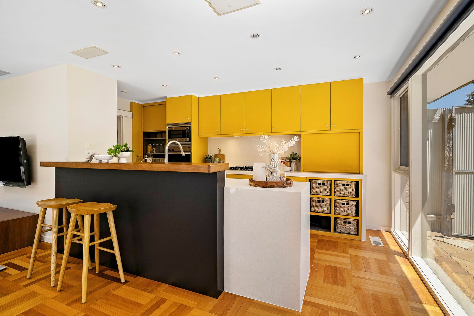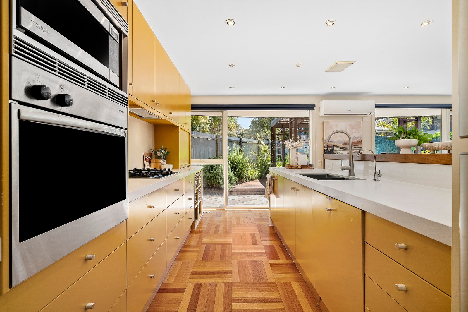 Artisan details are evident at every turn – a steep shingle-tiled gambrel roof, parquetry hardwood floors, grand skylights, new wool carpets and custom cabinetry including a magnificent mustard kitchen (which features in the Dulux 2025 Forecast colour trends for warm, bold hues).