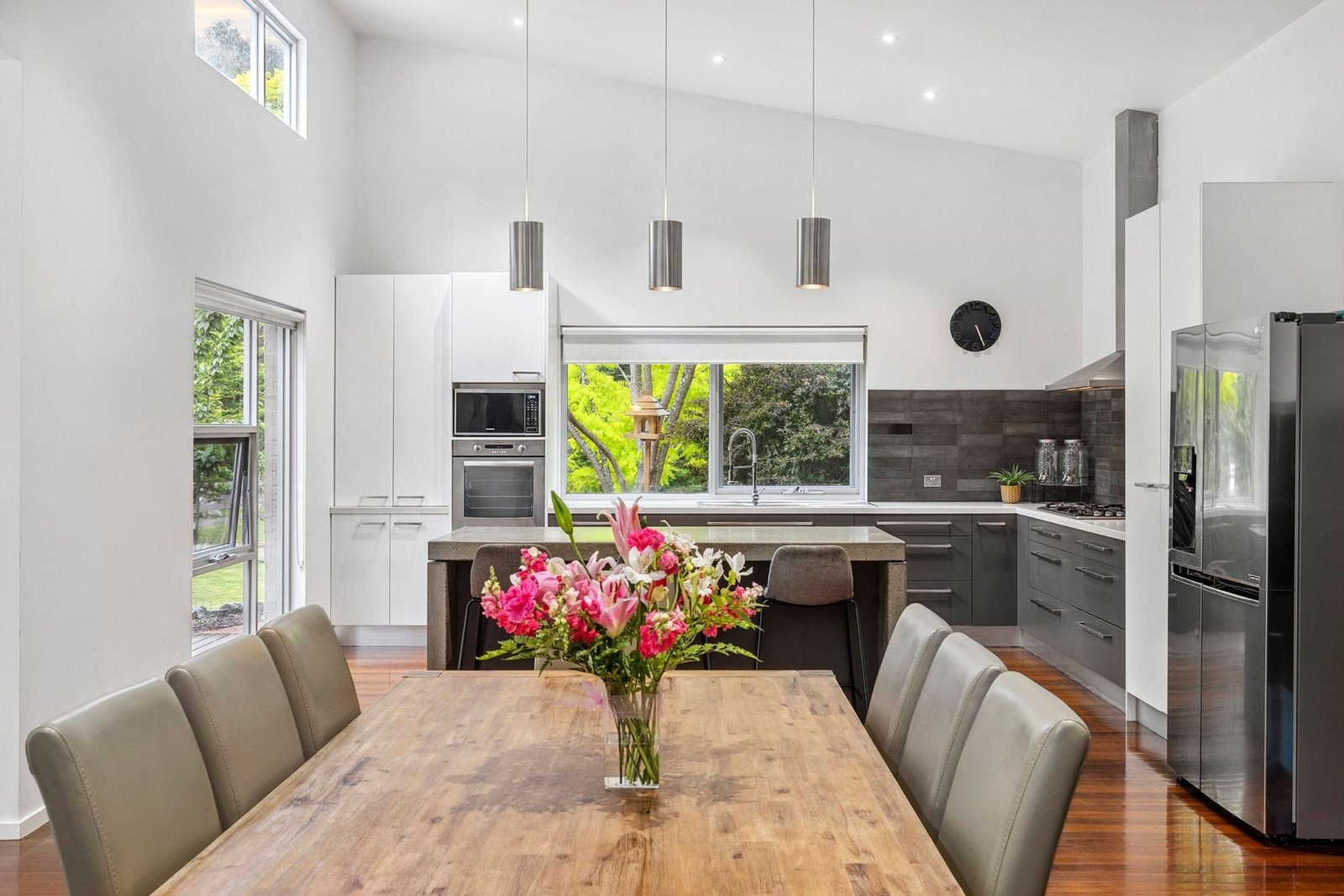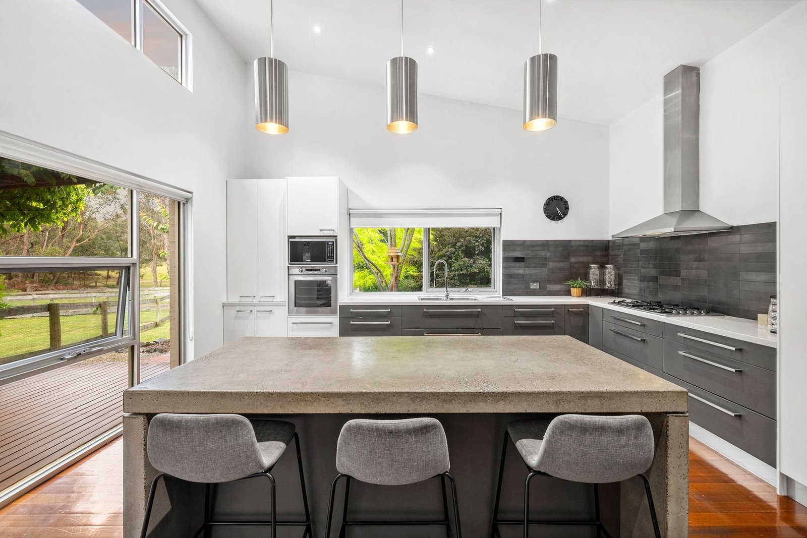 High ceilings and polished timber flooring in the main living areas enhance the home’s sense of openness, while a polished concrete island bench, stone benchtops and premium Westinghouse appliances bring a touch of modern sophistication to the kitchen.