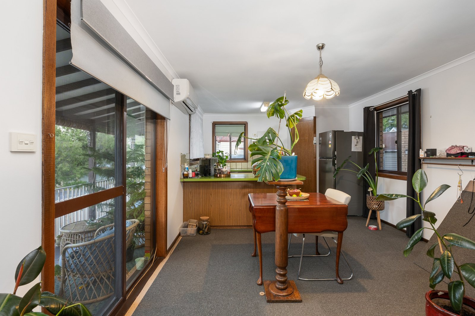 The kitchen is a standout feature with its original design, offering a walk-in pantry, plenty of storage, and views over the city. Adjacent to the kitchen are two separate living areas, both filled with natural light. The living spaces are equipped with a gas Rinnai heater and split systems for both heating and cooling, ensuring comfort no matter the season.
