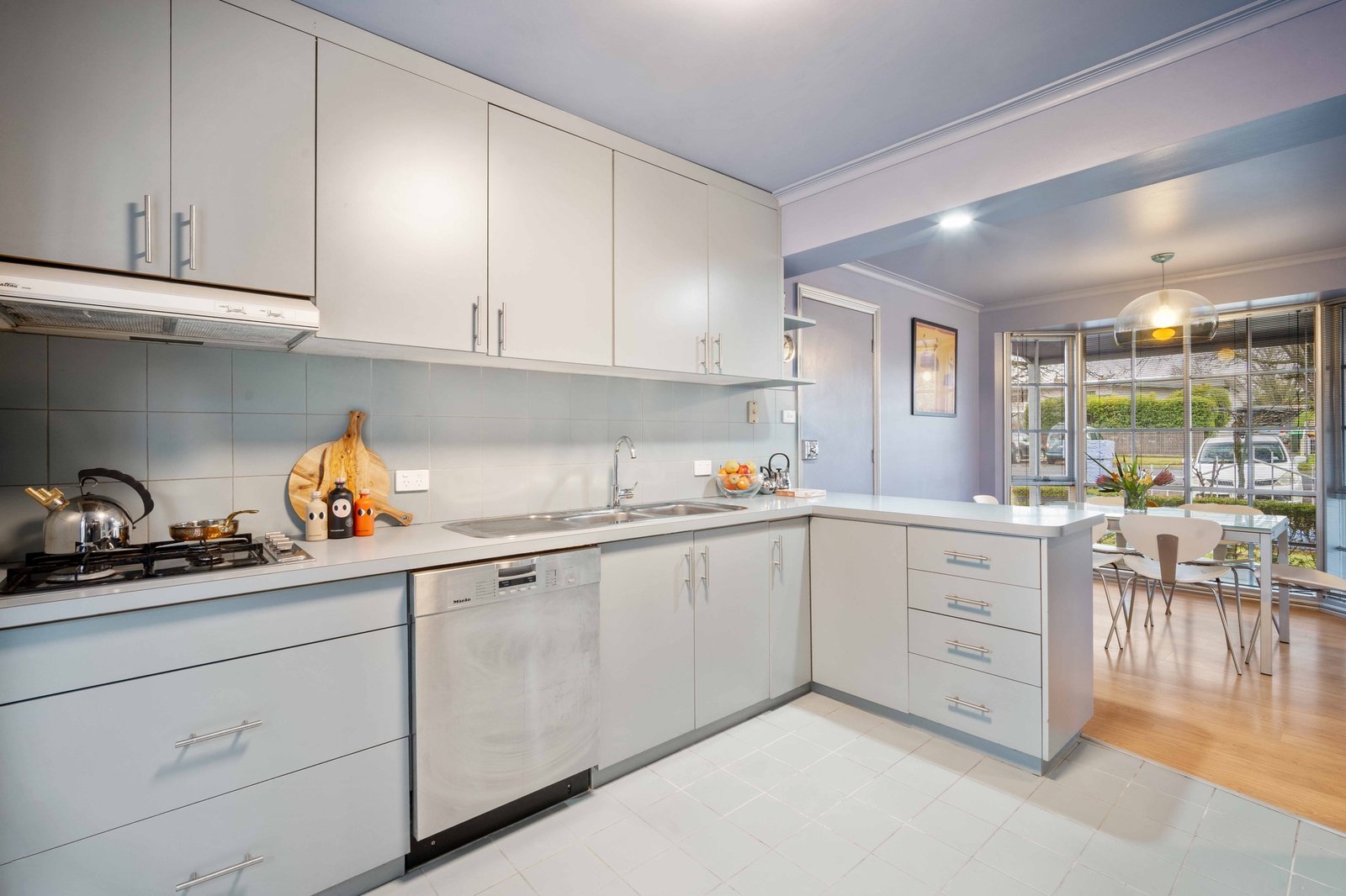 Downstairs, the open-plan kitchen, living, and dining area promotes a seamless flow throughout the home, with a split system for heating and cooling ensuring year-round comfort. The modern kitchen, equipped with a gas cooktop, electric oven, Miele dishwasher, and ample storage, is perfect for everyday cooking and casual dining. A separate downstairs toilet is located next to the laundry.