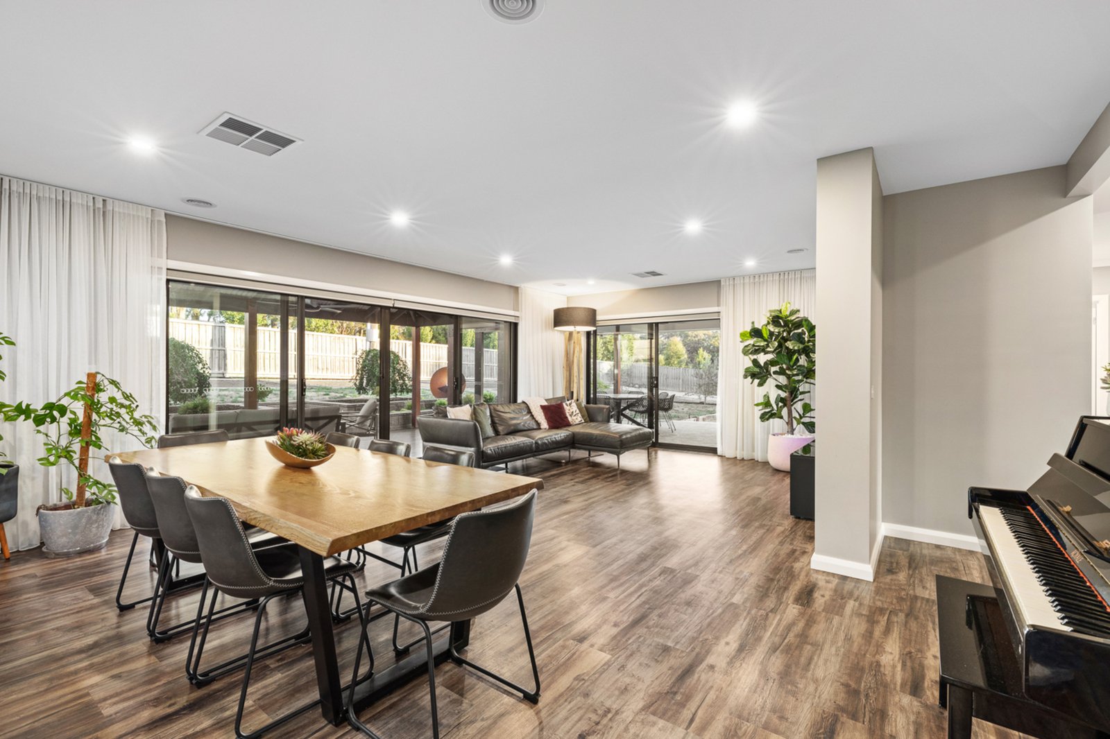 Step inside to find high ceilings and a thoughtfully designed layout, including four spacious bedrooms – three with walk-in robes and one with a built-in robe. The master suite boasts an ensuite with a double vanity, oversized shower, and toilet, while the family bathroom features a freestanding bath, large shower, vanity, and separate toilet. The open-plan kitchen, dining, and living area is bathed in natural light, with a stunning Caesarstone benchtop with a waterfall edge, gas cooking, and a walk-in pantry taking centre stage. Additional highlights include a formal living area, a large laundry, double-glazed windows, and year-round comfort with gas central heating and evaporative cooling.