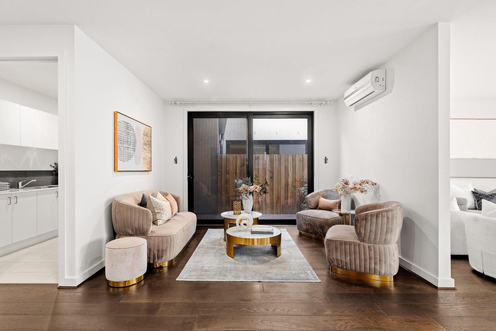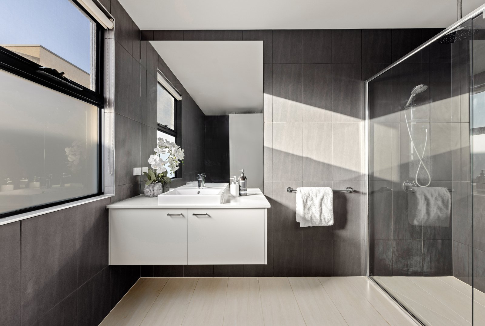 The ground floor introduces an elegant sitting area/foyer that sets the tone for the home’s sophisticated design. A guest suite on this level features mirrored built-in robes and a hotel-inspired ensuite, complete with a rainfall shower and stone-topped vanity.