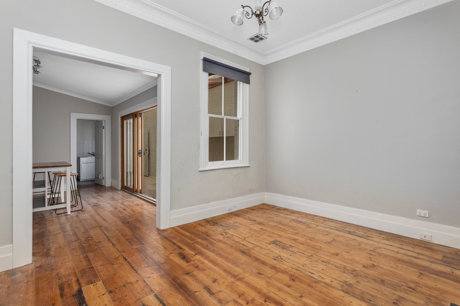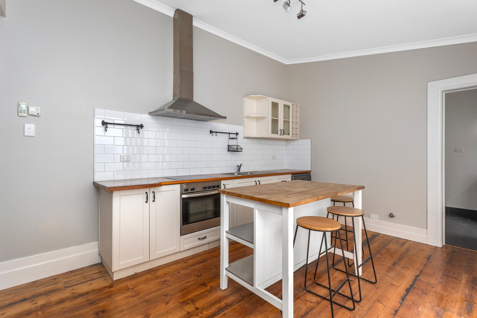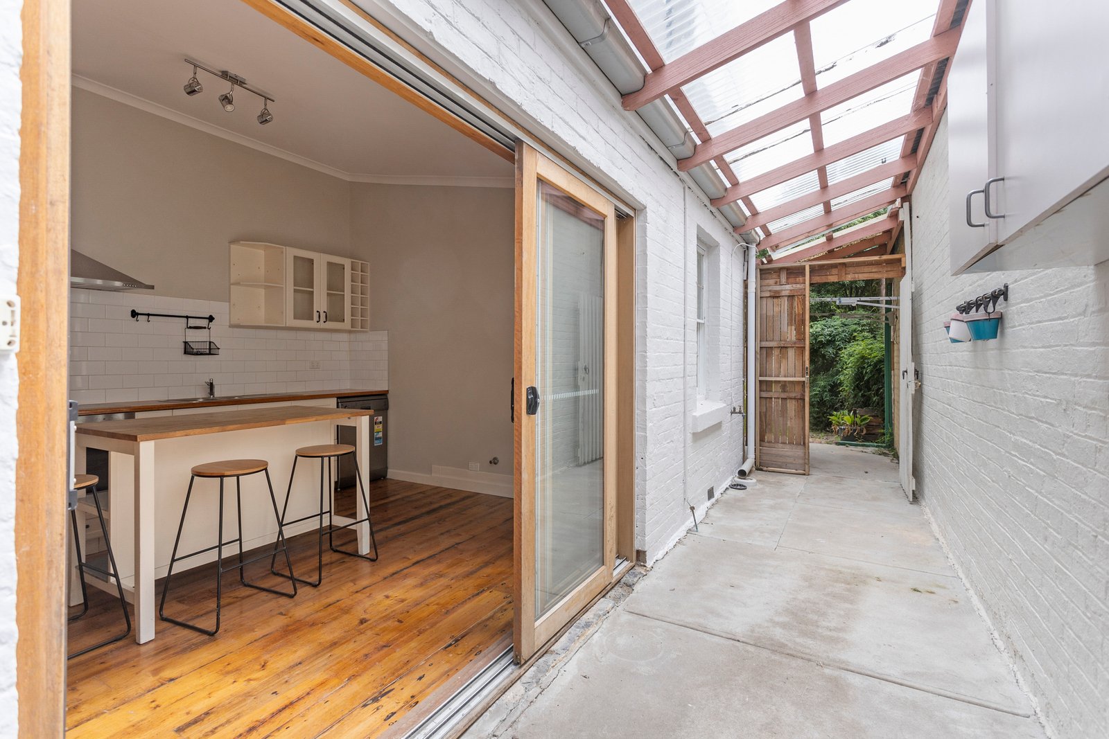 Featuring a spacious front bedroom off the hallway, with cozy carpet underfoot—along with a large separate living area (or potential second bedroom), the home flows seamlessly into an open-plan kitchen/dining area at the rear. The kitchen features white subway tiles, a dishwasher, and a well-designed layout, perfect for modern living. Timber floorboards run throughout, adding warmth and character to the space.