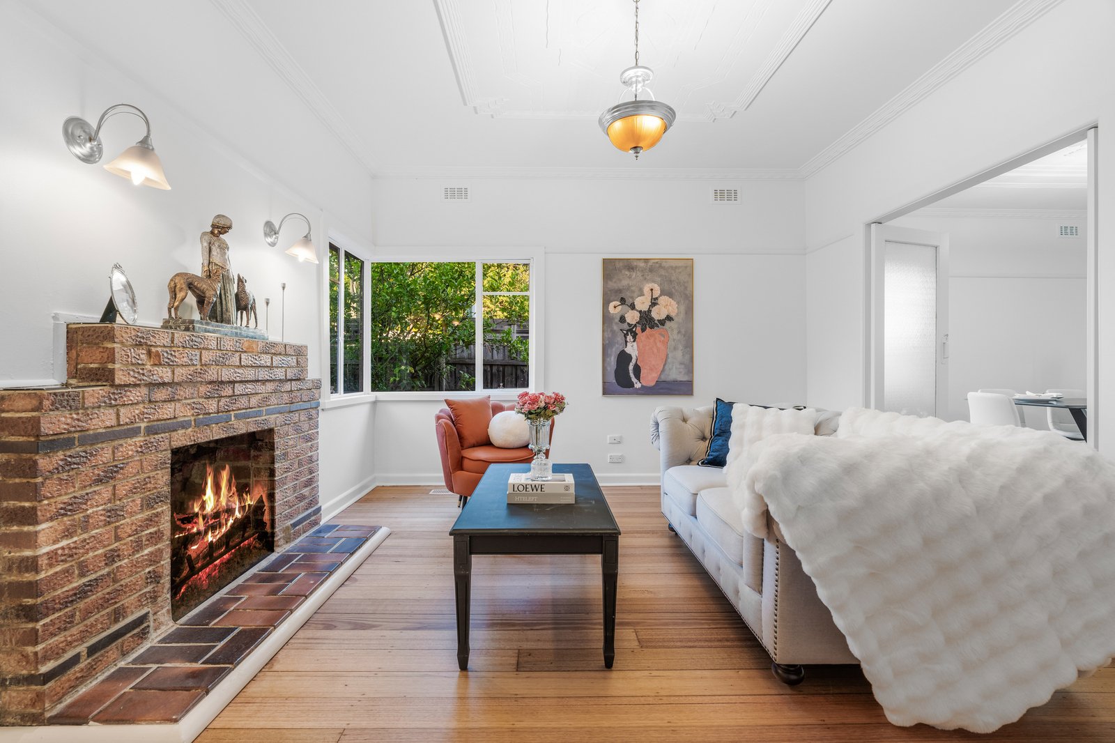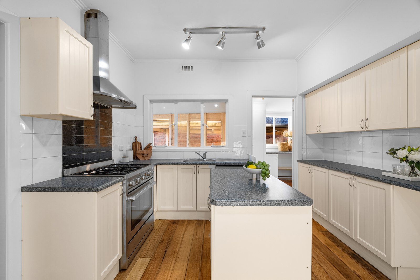 Showcasing a functional family kitchen, complete with generous bench and cupboard space, as well as stainless steel appliances, including a 5-burner gas cooktop and under-bench oven. A dedicated dining area, bathed in natural light, complements the large lounge, which is equipped with a fireplace.