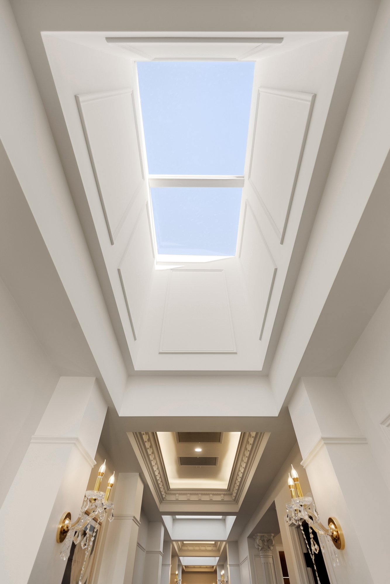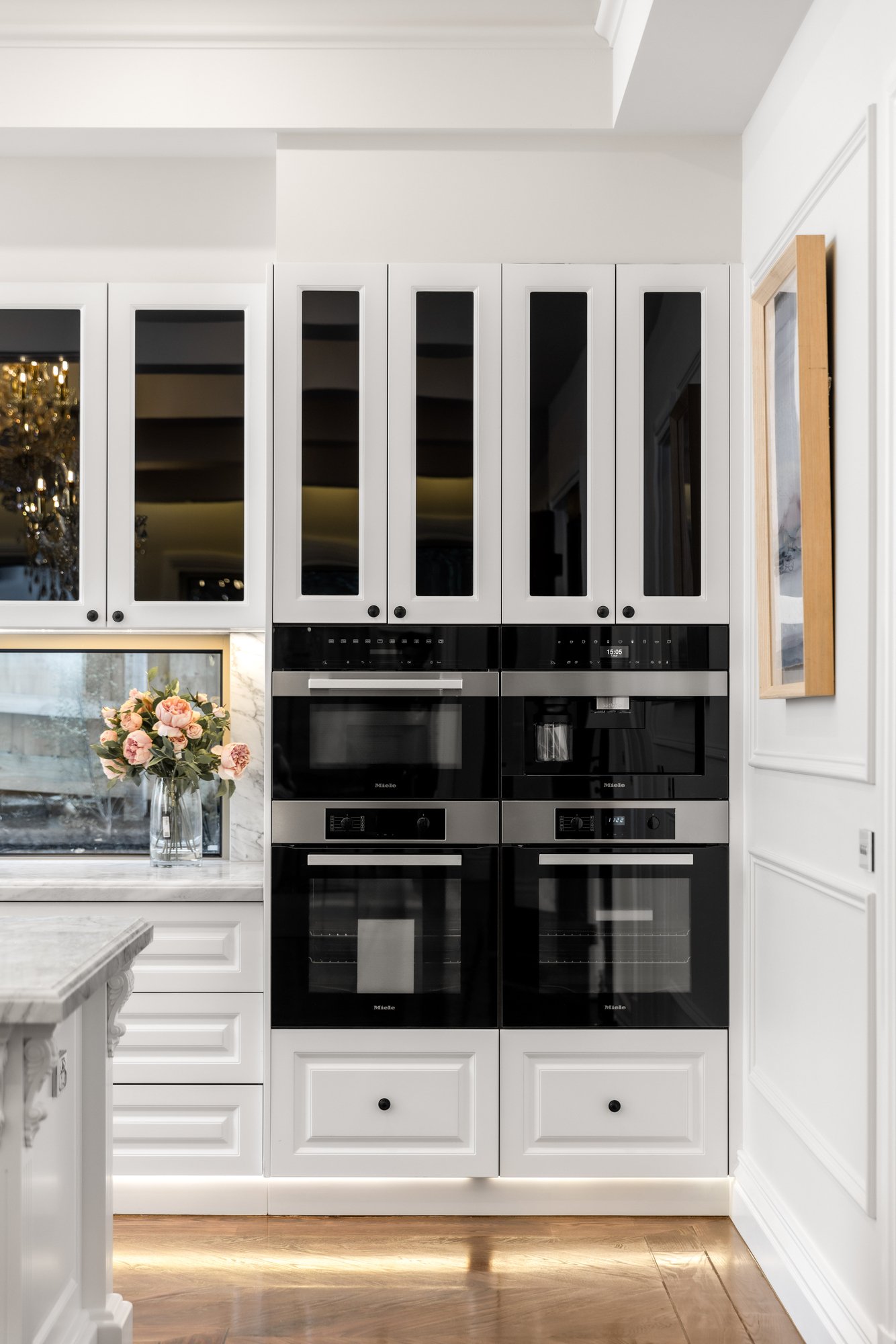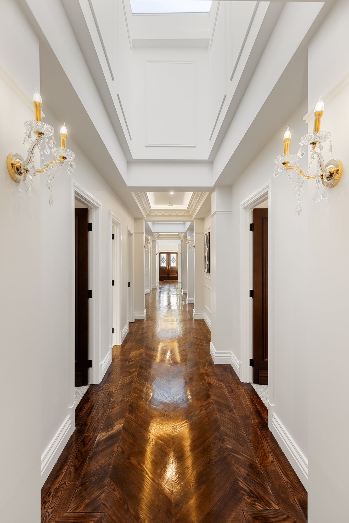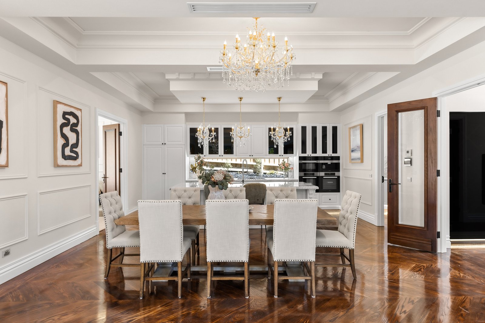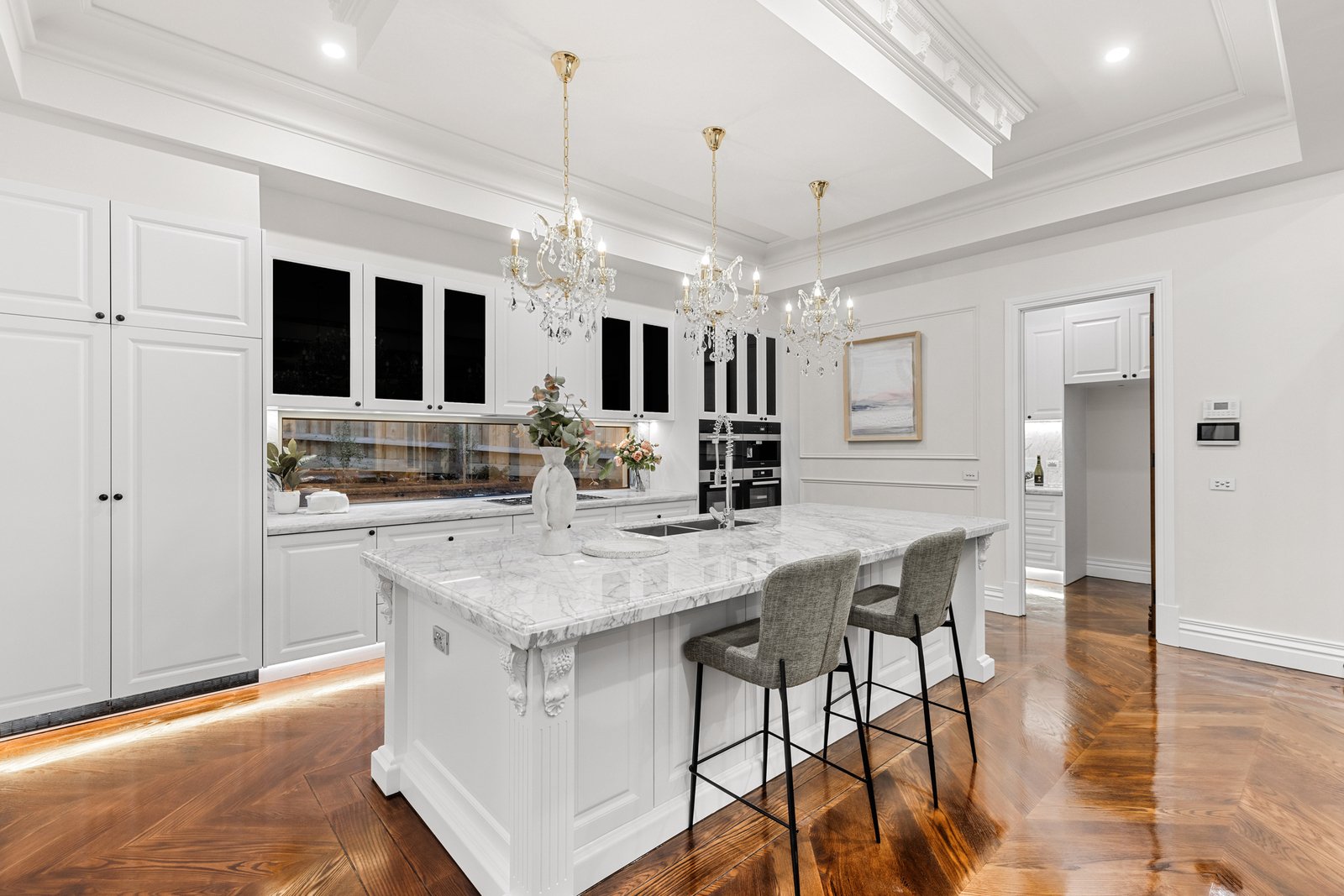 Step through the grand French door entrance into a light-filled interior, where skylights illuminate the open-plan design, creating a bright and inviting ambiance. The heart of the home is the stunning gourmet kitchen, complete with Miele dual ovens, integrated fridges, a built-in microwave, and a coffee machine. Adjacent is the butler’s kitchen, providing extra space for meal preparation and storage, ensuring effortless entertaining.