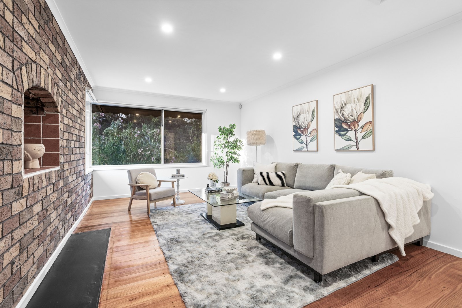 Upon entry, you are welcomed by a sun-drenched open-plan family and dining area, creating a warm, inviting atmosphere perfect for both intimate family gatherings and sophisticated entertaining. The adjoining kitchen boasts premium appliances, sleek cabinetry, and ample storage, making it an ideal space for culinary creations. The expansive family area features timber flooring and a charming red-brick fireplace, which imparts a cozy, homely feel to the space.