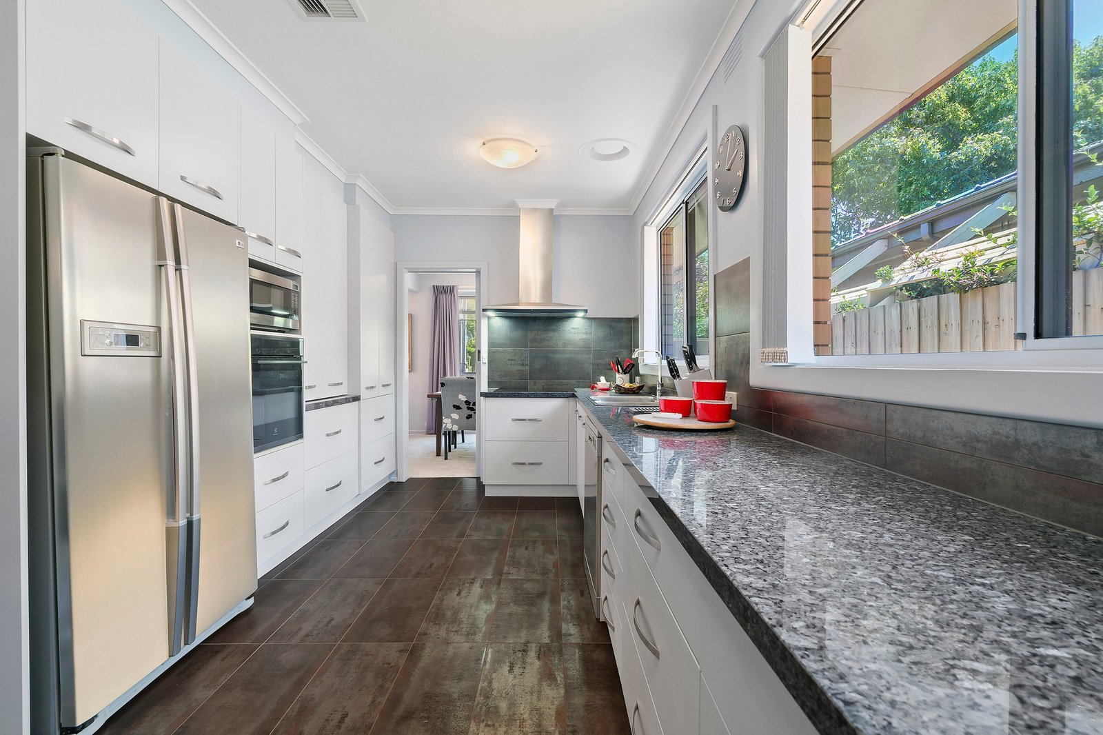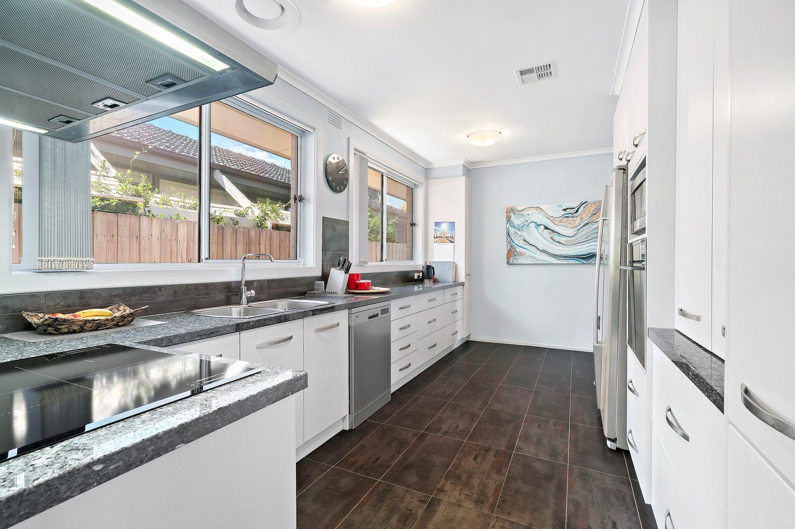 A modern kitchen impresses with its commercial sizing – big enough to fit its own dining table, and designed with granite benches, metallic floor tiles, an appliance cupboard and premium appliances including an induction cooktop.