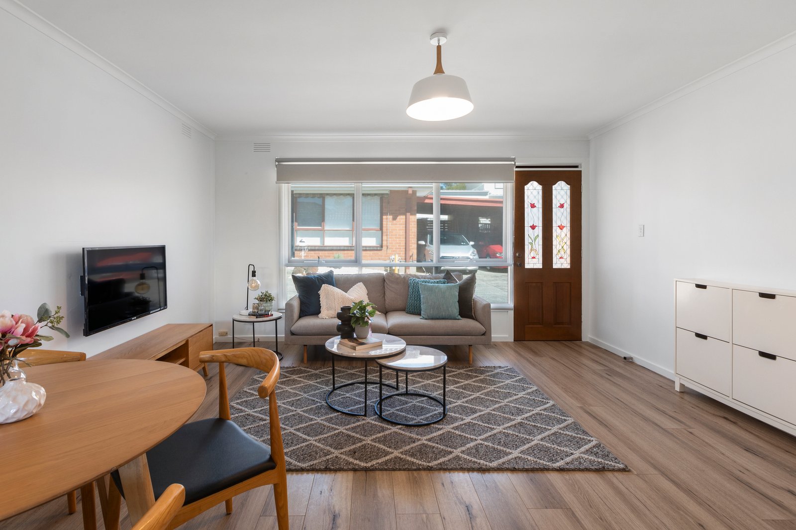 Set away from the road in a quiet and neatly maintained classic-style group, the single-level home has been fitted with chic wide-board floors, with accommodation comprising an open plan living/dining area, a smartly-finished kitchen with quality appliances (including an integrated dishwasher) plus a beautiful new bathroom where floor-to-ceiling tiles, floating vanity and mirrored storage are highlights.