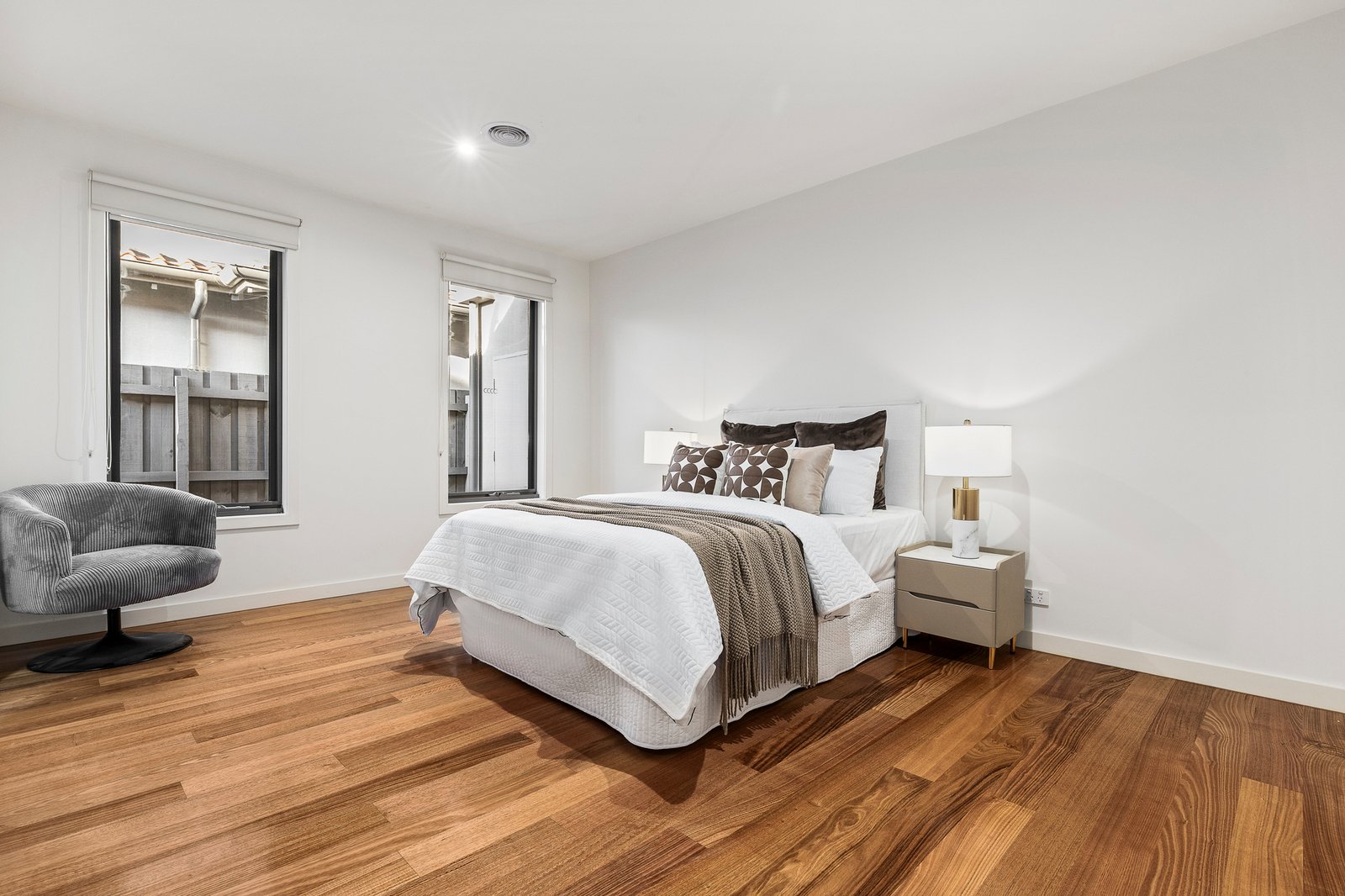 Double doors open to a sought-after ground-floor main suite with a walk-in robe and a fully tiled ensuite. Upstairs, a light-filled accommodation zone comprises two additional bedrooms with built-in robes and a dedicated study area, ideal for children at any stage. The family bathroom features a stone vanity, a bathtub, and a separate WC.