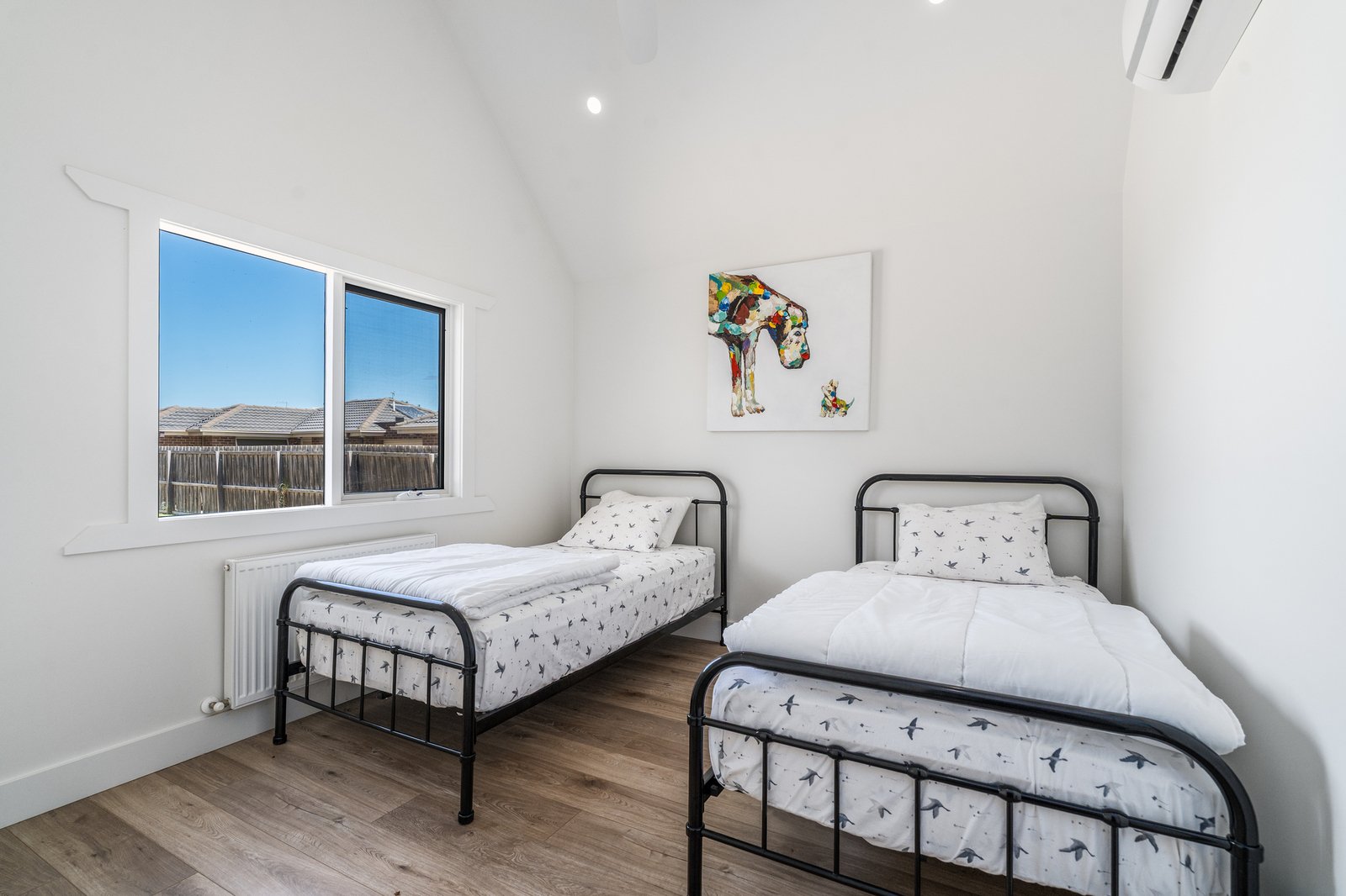 Positioned on an expansive 849m² block, this picturesque two-storey residence offers an exceptional opportunity to embrace the Portarlington lifestyle, just an 800-meter walk to the bay. Thoughtfully designed for both comfort and functionality, the ground floor living area is the heart of the home, boasting soaring 5.2-meter-high cathedral ceilings that create an incredible sense of space and light. Large windows frame the lush surroundings, while dimmer switches and downlights throughout enhance the modern appeal. The well-appointed kitchen is a chef’s dream, featuring premium Ilve appliances and a butler’s-style walk-in pantry that runs the full width of the kitchen, providing additional bench space, shelving, and ample storage. Climate control is taken care of with four split systems, ceiling fans, and a radiant heating system, ensuring year-round comfort. A built-in desk area provides the ideal home office setup, making remote work or study a breeze.