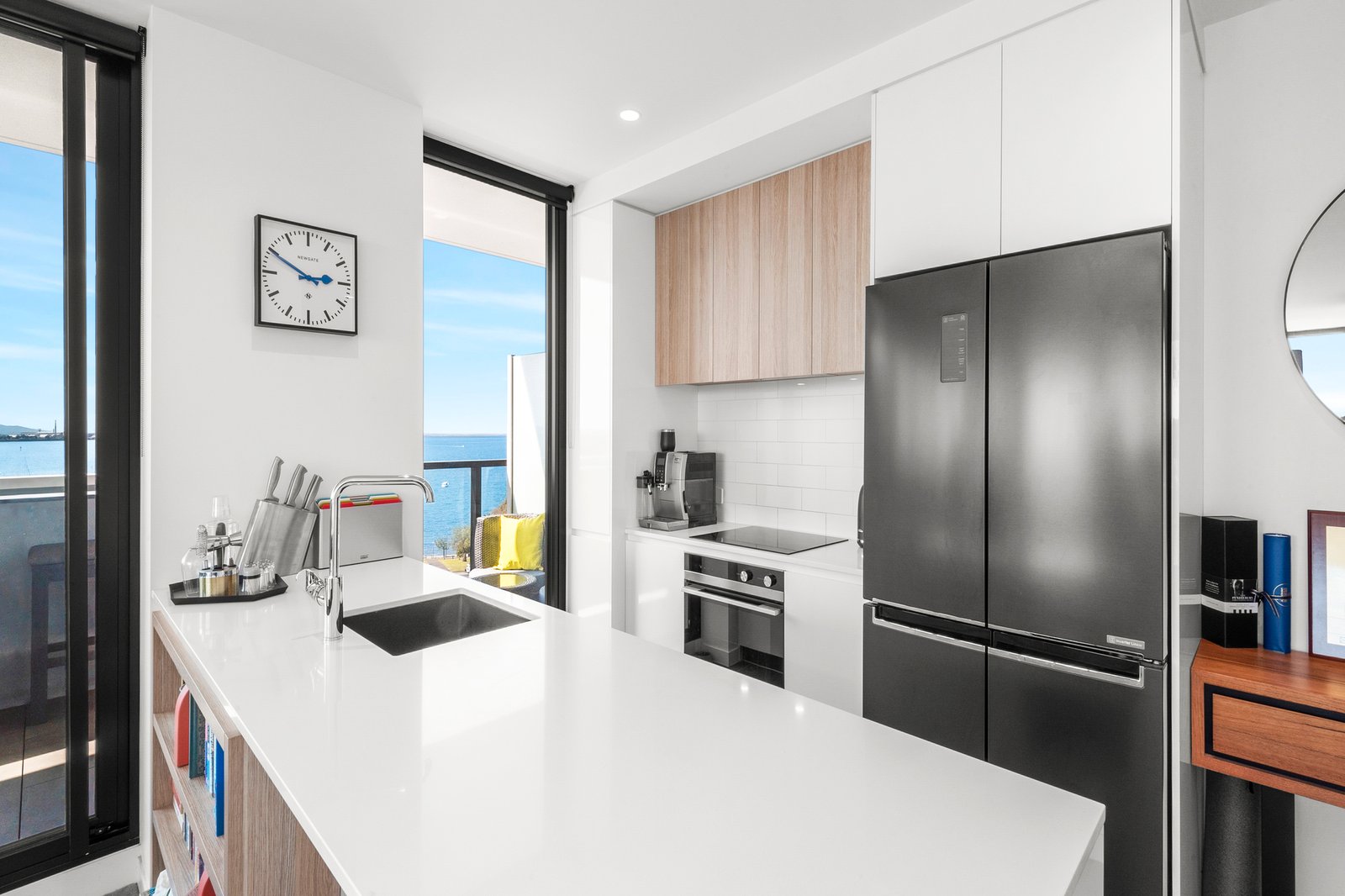 Stepping inside the apartment, the stylish tones of the interiors and quality finishes will immediately impress. The entry hall leads through to a light-filled open plan living area revealing floor to ceiling windows with a breathtaking vista over Corio Bay and the vibrant city surrounds. The high-end kitchen features waterfall stone benchtops, modern appliances including 600mm oven, induction cooktop, integrated dishwasher, sleek cabinetry and excellent storage provisions. Glass sliders open up from the dining and living areas to a spacious north facing balcony, providing the perfect platform to enjoy your morning coffee or evening wine, whilst taking in the ever-changing scenery of the Waterfront.