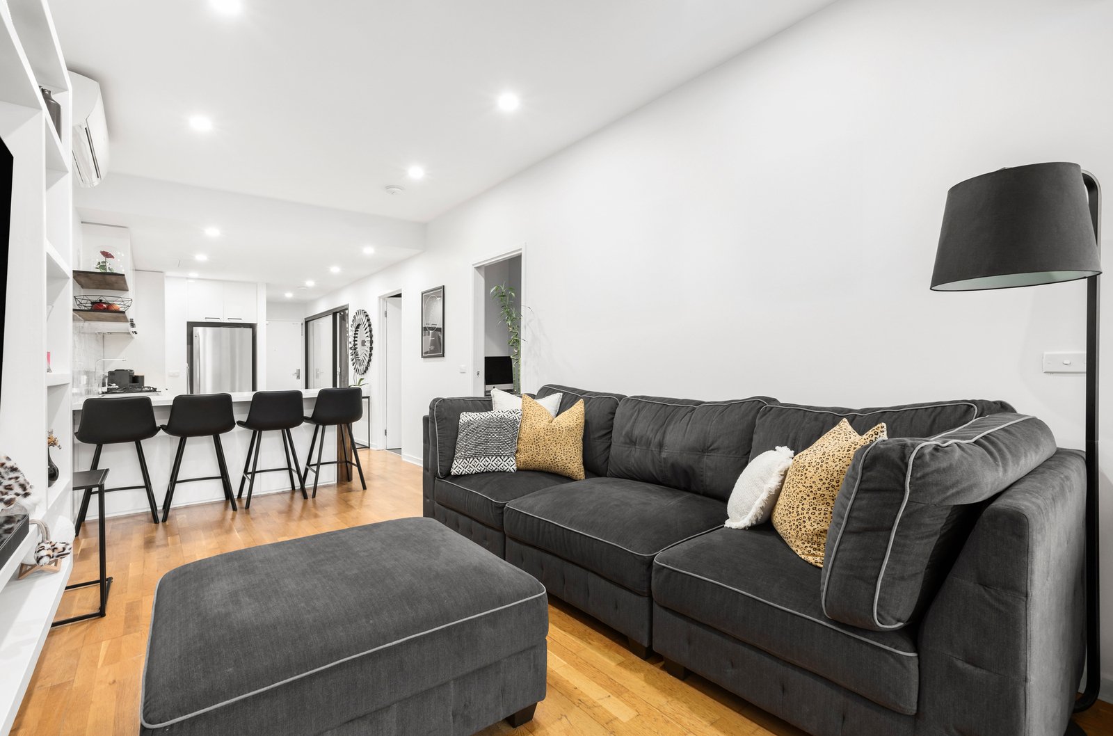 Bathed in natural light, the open-plan layout creates a seamless flow between living and entertaining spaces, ideal for relaxing or hosting guests. The gourmet kitchen is a true standout, featuring sleek stone benchtops, a striking marble splashback, European cooking appliances, a dishwasher, and a breakfast bar – perfect for casual meals or entertaining in style.