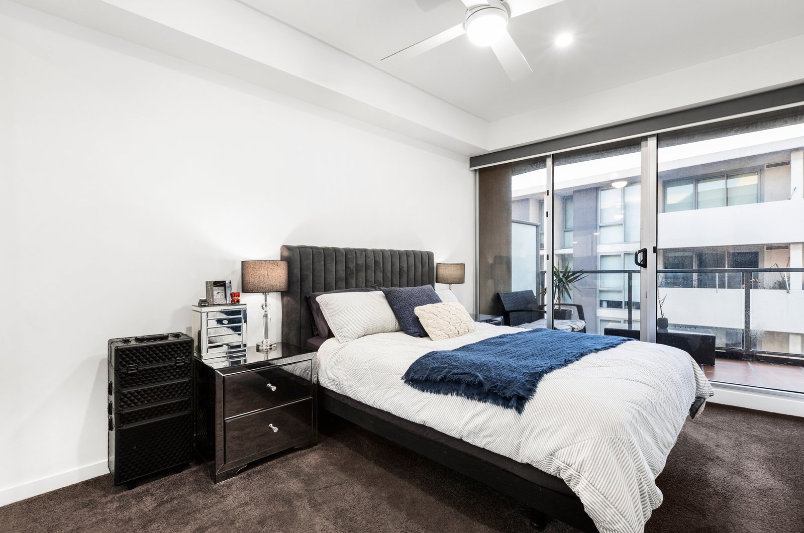The apartment boasts two generously sized queen bedrooms, each with built-in robes, while the master suite enjoys private balcony access and a dedicated workspace. The luxurious central bathroom is a sanctuary in itself, showcasing an oversized twin rainfall shower, dual vanity, and a separate laundry with ample storage for added convenience.